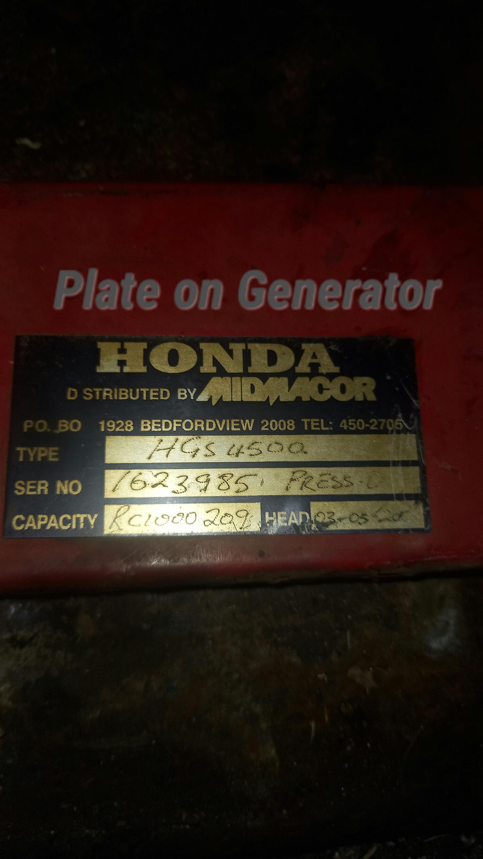 Honda HG4500 With A GX270VXU Engine 4.5Kw, 4.2KVA Gasoline Generator With A Sincro Alternator. Features: 230V 50Hz Fitted With 2 X 15Amp Plugs And Circuit-Breaker.. The Generator Weighs 79.5 kg (dry weight) And Has Dimensions Of 681 x 530 x 571 mm. It Utilizes a Manual Starter, Is Air-Cooled, and Includes D-AVR Technology