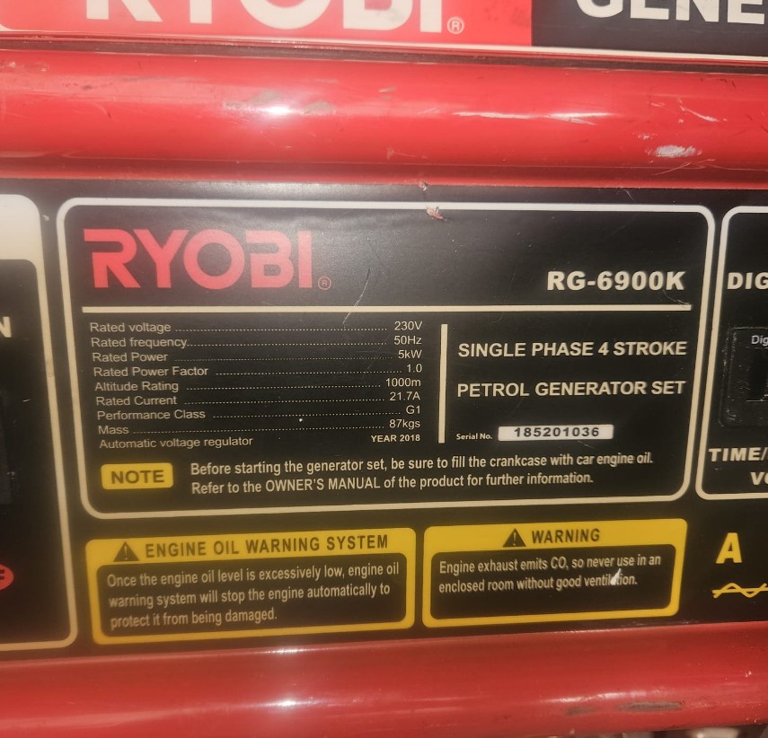 Ryobi Generator RG-6900K 5000 watt - perfect working order - same one selling on Takealot new for R17900 (https://www.takealot.com/ryobi-generator-4-stroke-battery-key-start-5-5kva/PLID34187775)