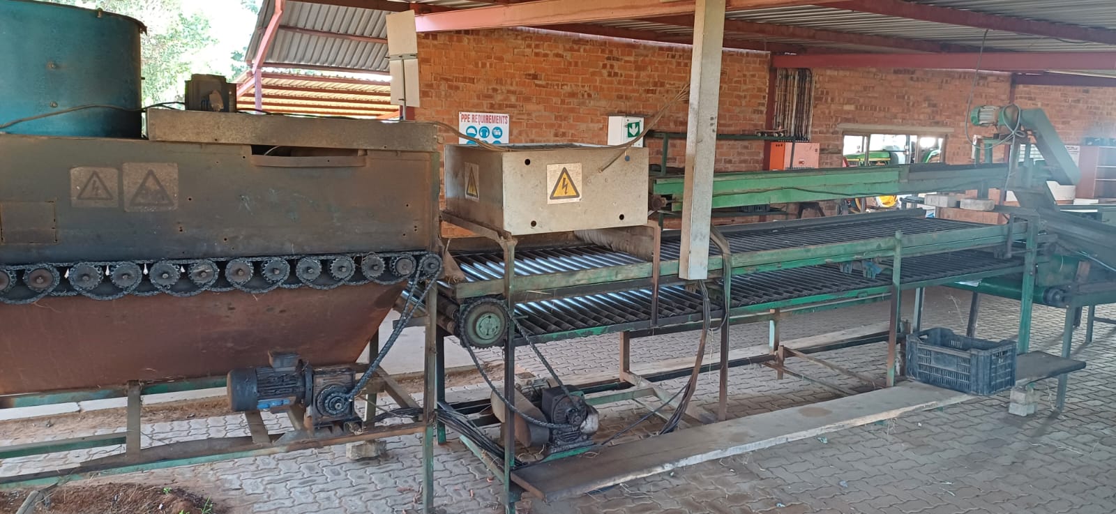 Beet Pakhuis, Hopper, Knipper, Wasdrom, Elevator, Fans, Uitsoektafel, Paktafel, Return tafel, Scrap hopper. Netjiese kontrole kas.