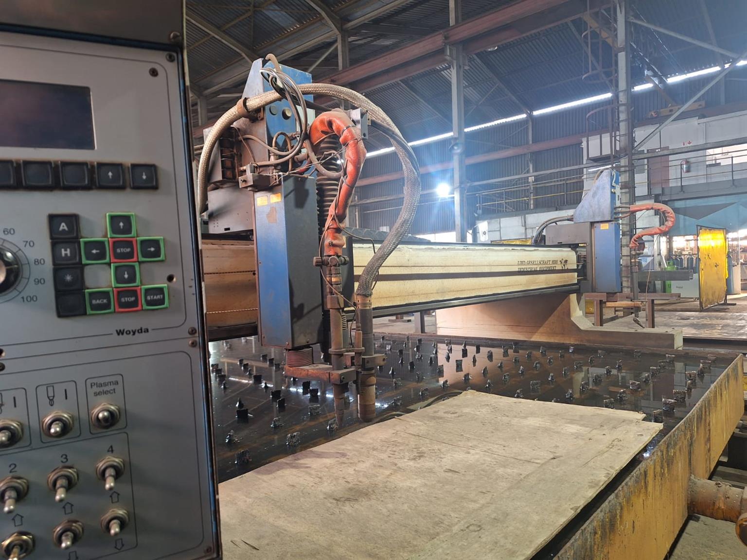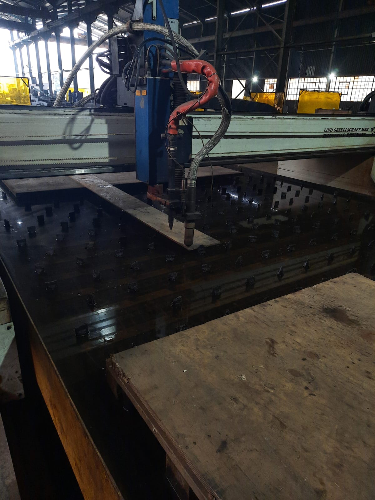 Plasma Cutting machine cutting up to 40mm thick steel plates with a 13mtr bed which can be extended to 26mtr