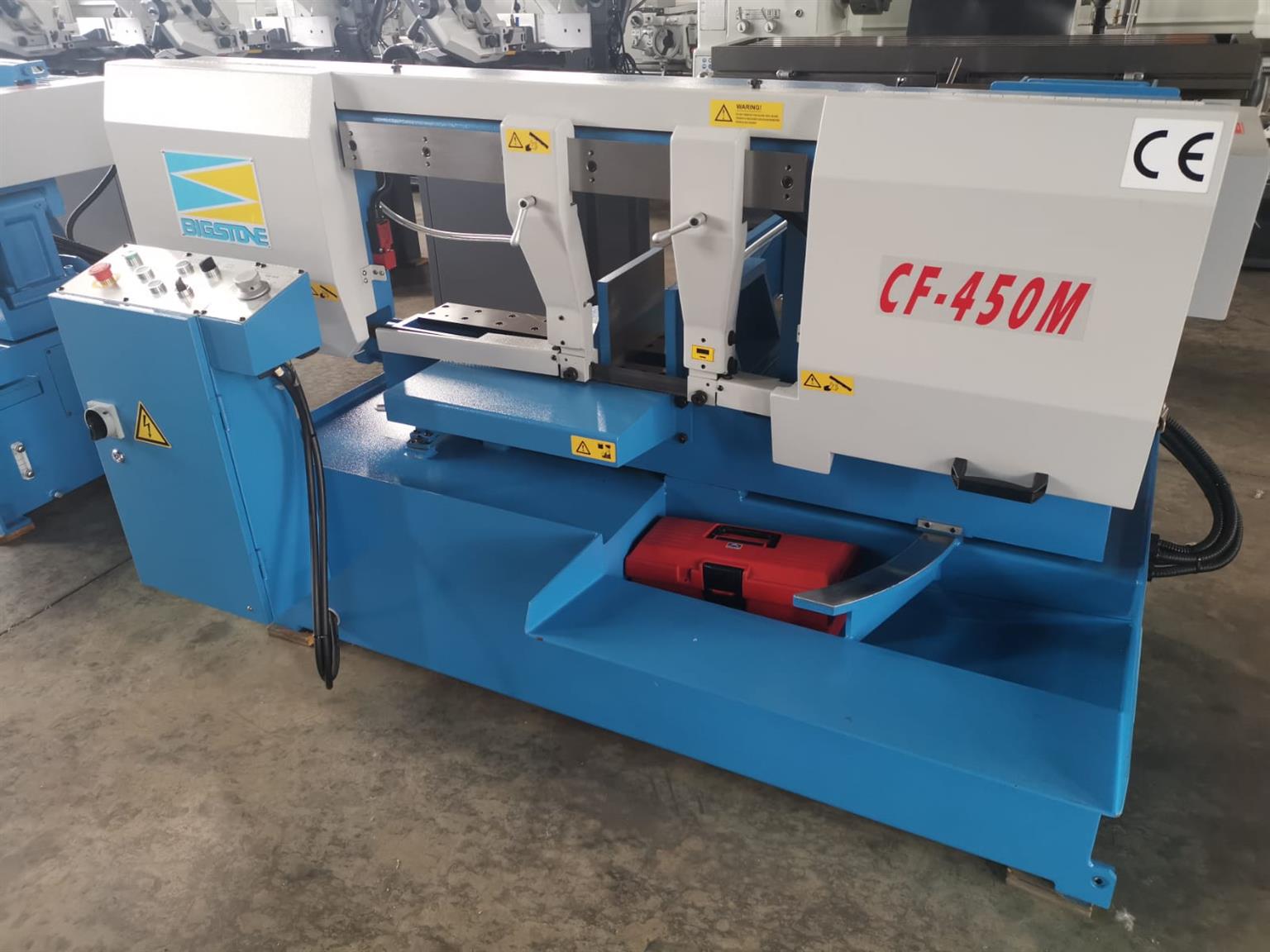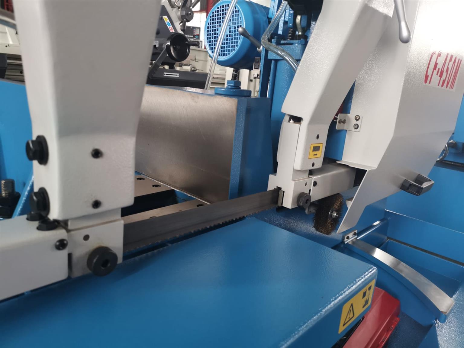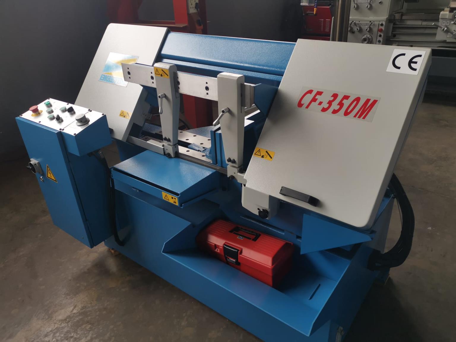 The Big Stone CF-350M is a semi-automatic miter cutting band saw designed for precision cutting. Cutting Angles, Swivel Saw Bed, Hydraulic Vice, Blade Tension Gauge, Tungsten Carbide Roller Guides, Automatic Positioning
