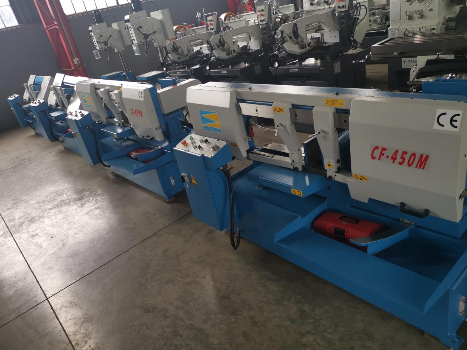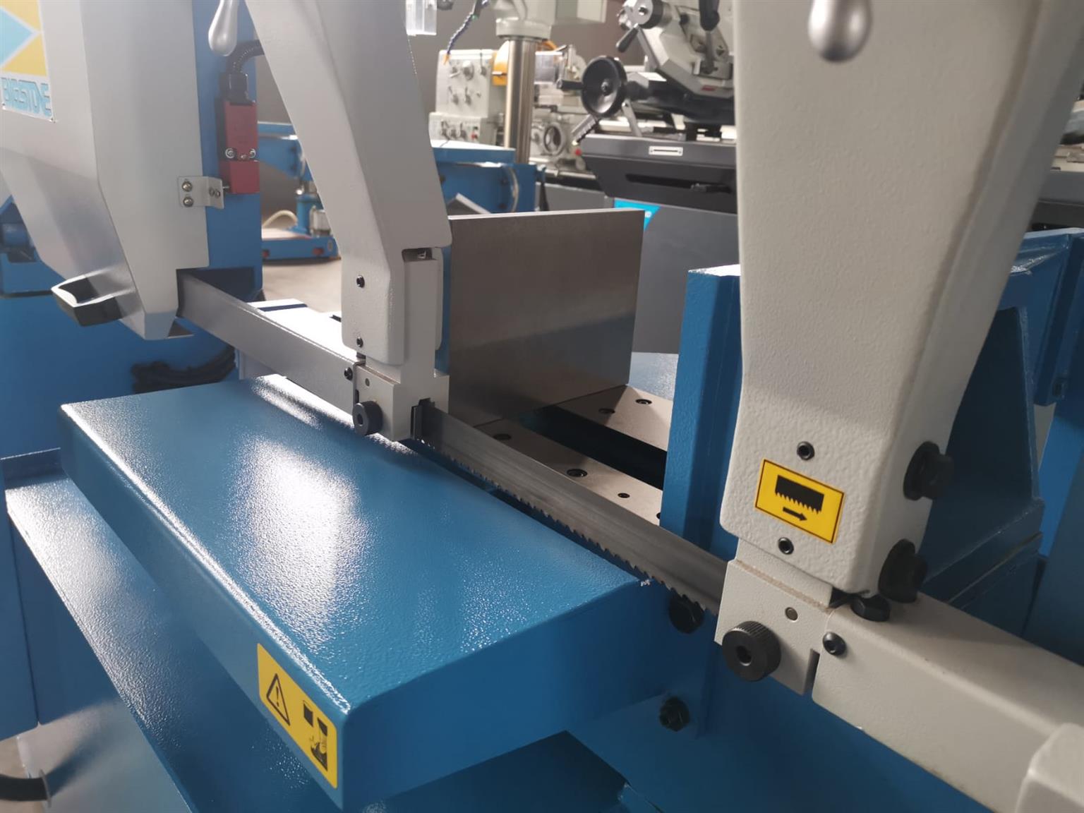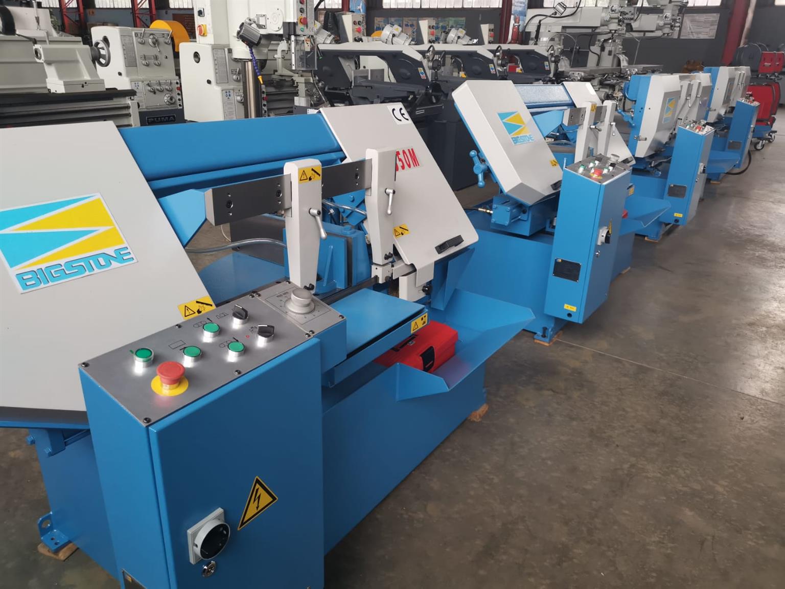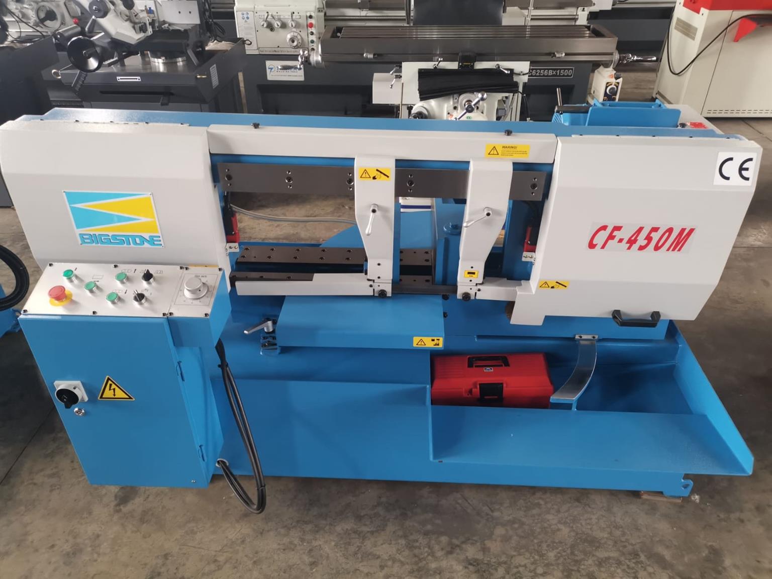 The Big Stone CF-350M is a semi-automatic miter cutting band saw designed for precision cutting. Cutting Angles, Swivel Saw Bed, Hydraulic Vice, Blade Tension Gauge, Tungsten Carbide Roller Guides, Automatic Positioning
