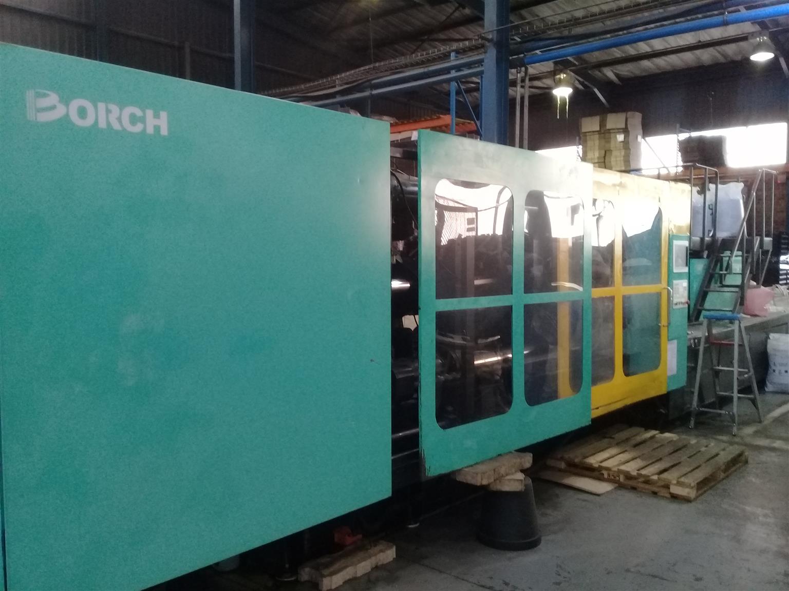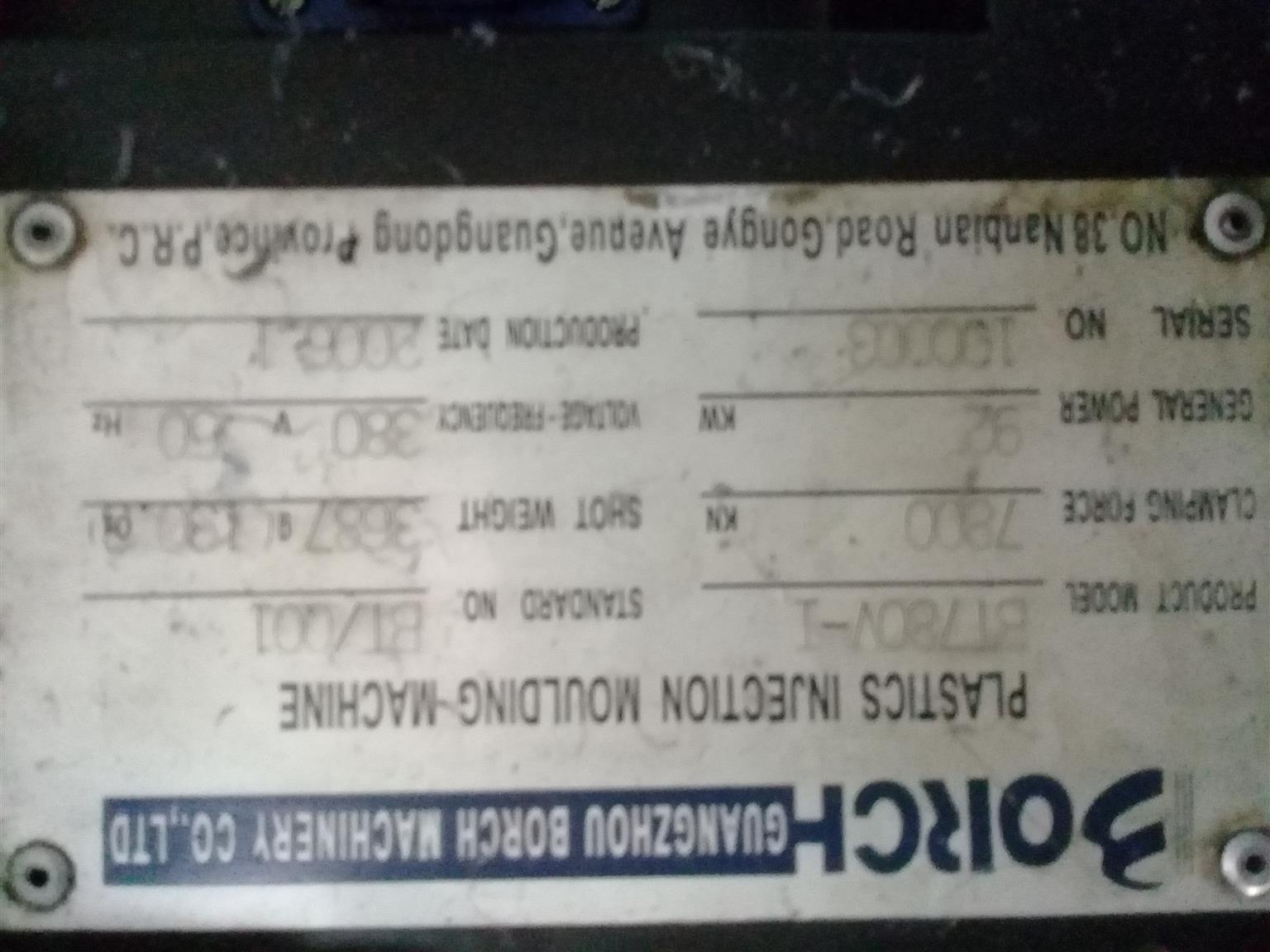 Borche 780t injection moudling machine for sale.Very good running condition , in daily use for manufacturing PP crates. Max shotweight 2900gm