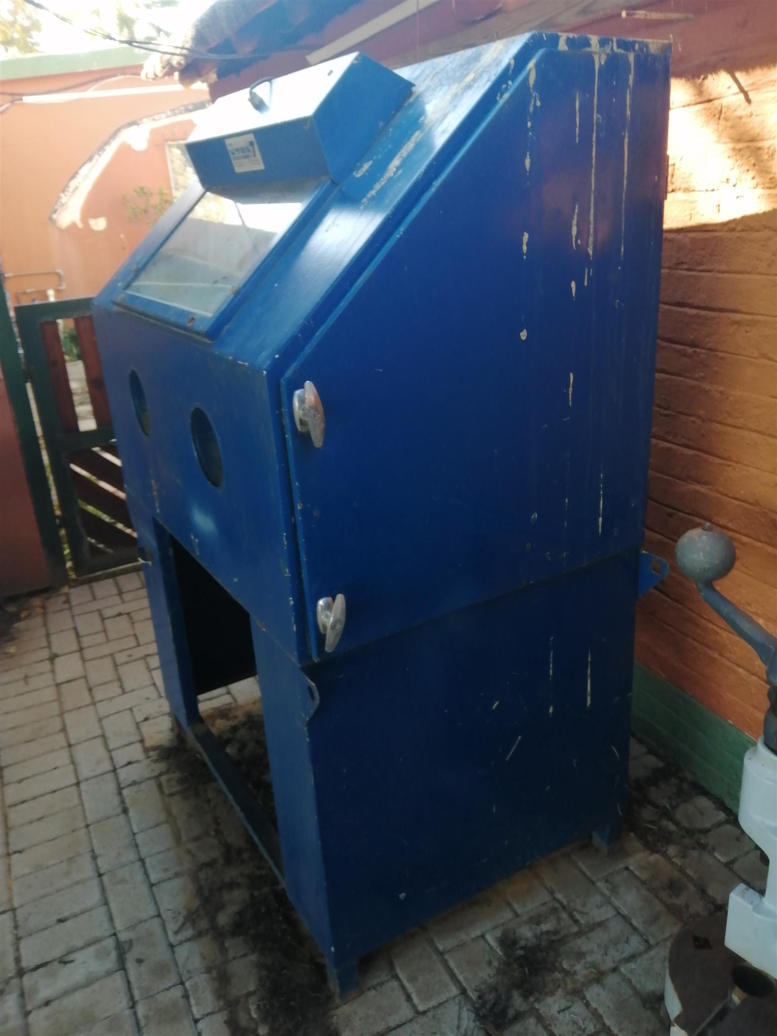 Cabinet sand blasting machine. Large volume 220 Volt operating machine.