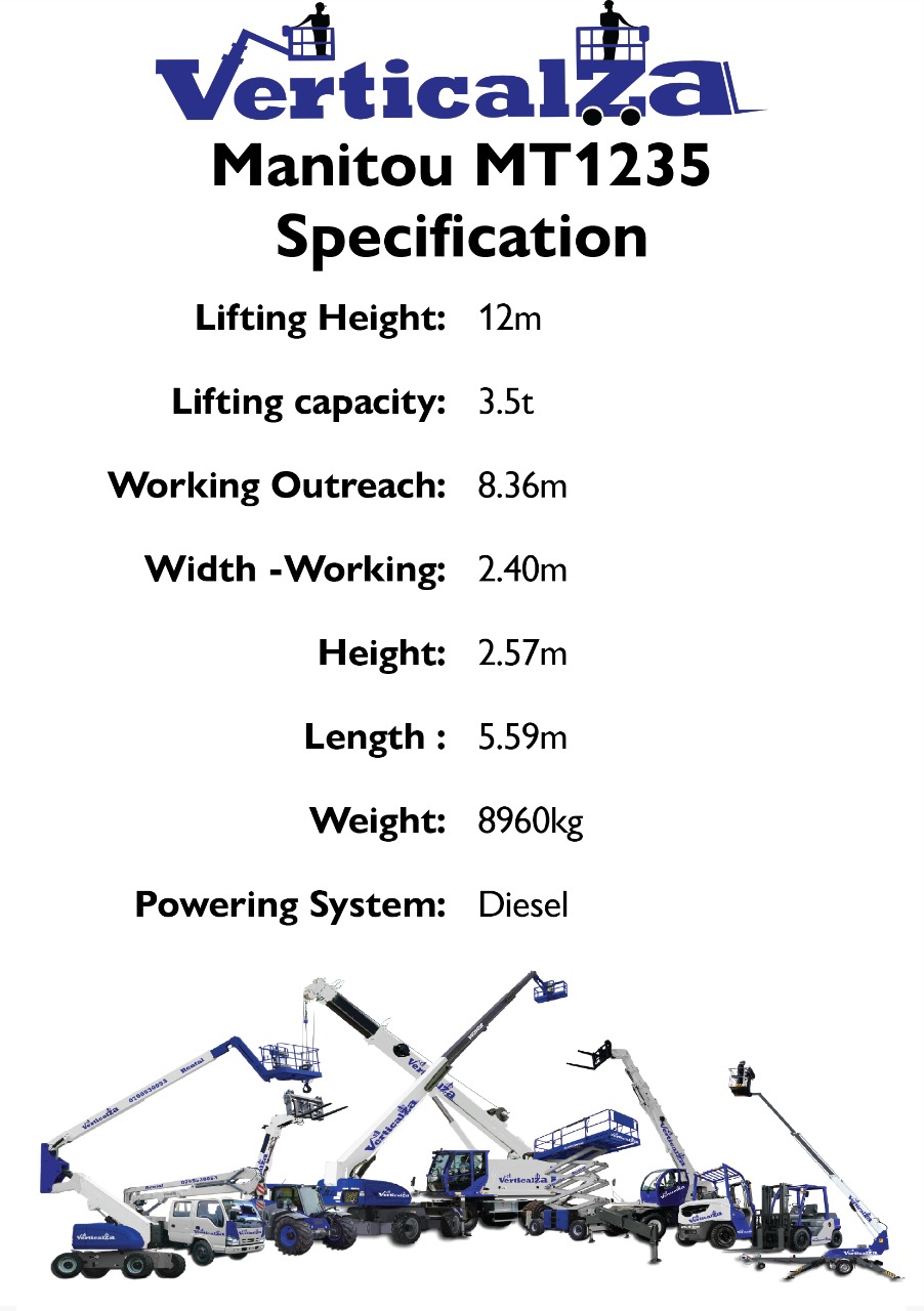 VerticalZA - Manitou MT1235 Telescopic Forklift / Tele-Handler. Reaches 12m and lifts 3.5tons. Have bucket attachment available for loading concrete etc. Very Versatile. Ideal for steel construction work, and lifting heavy objects to hard-to-reach places. Ideal for stocking/packing high shelves in large warehouses etc. For Rent on Daily/ Weekly/ Monthly Basis, Call: 076-553-0053view more or visit VerticalZA on our website www.verticalza.co.za.