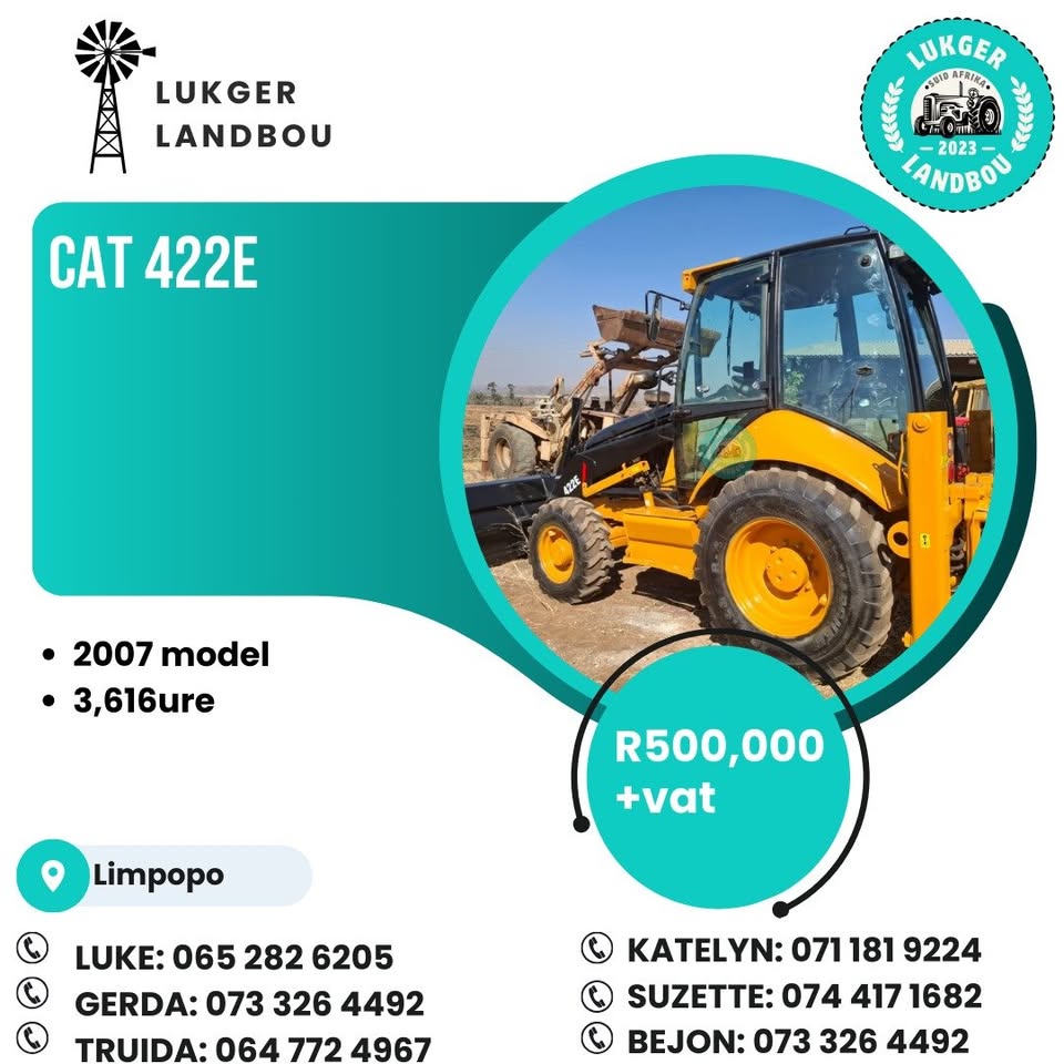 Cat 422 E 2007 model, 3616 ure. R500000.00 + vat. Limpopo. Kontak Gerda 0733264492view more