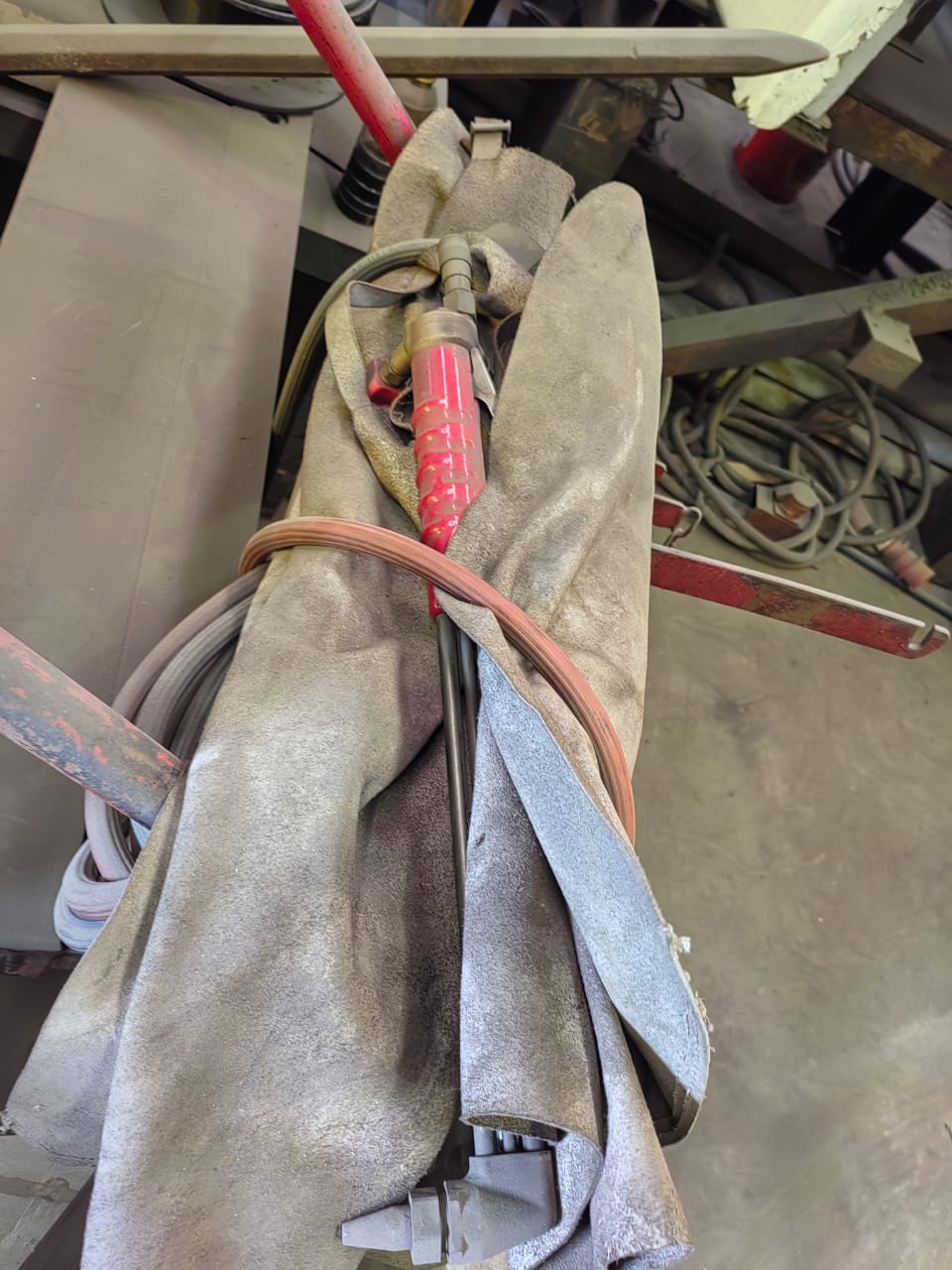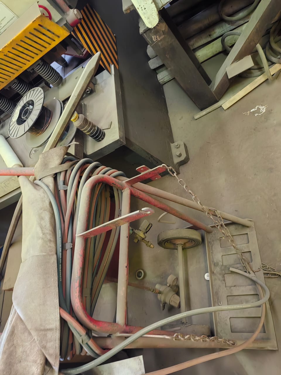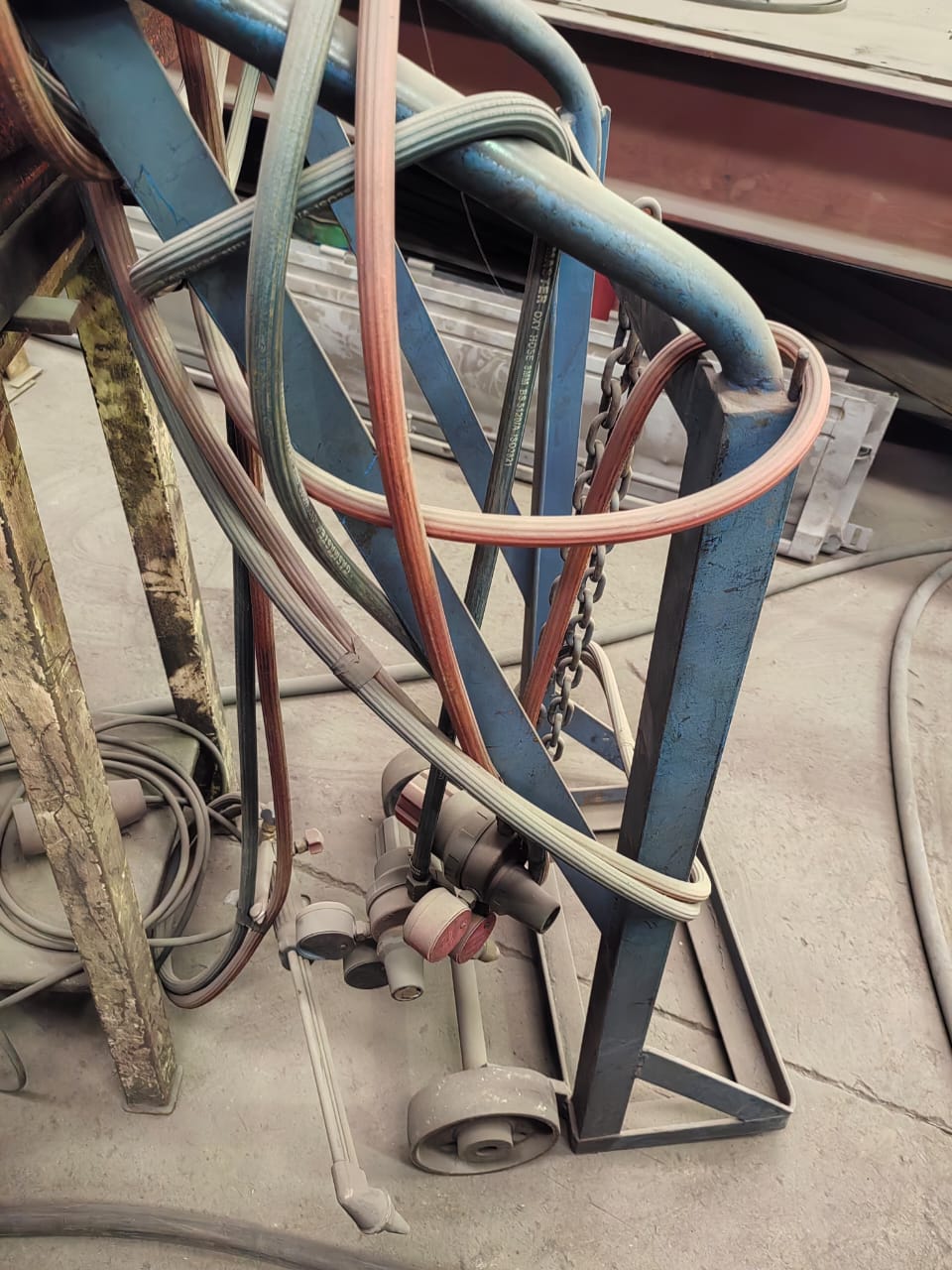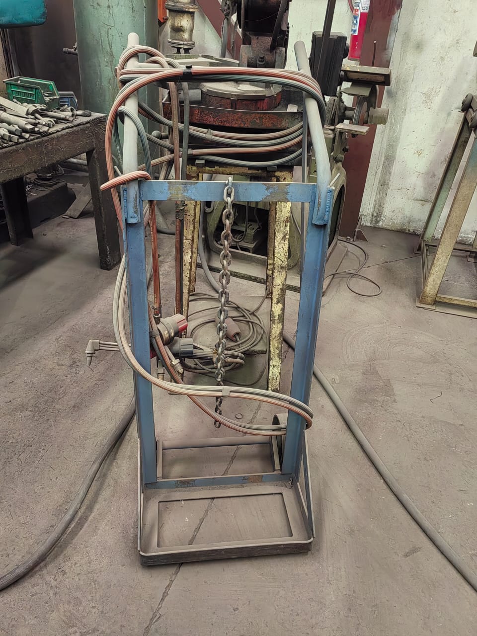 Cutting torch with trolley and pipes. More details:
