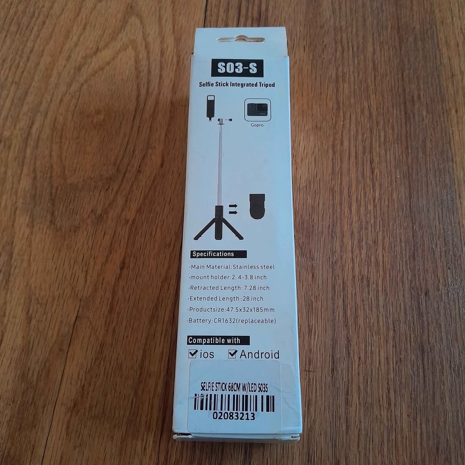 ​Take your selfies and videos to the next level with the S03-S Selfie Stick Integrated Tripod! This all-in-one gadget combines a sturdy selfie stick with a stable tripod stand and a built-in LED Selfie Light for perfect lighting, day or night. ✨ ​Key Features: ​2-in-1 Design: Selfie Stick and Tripod Integrated. ​LED Light: Built-in selfie light (as indicated by the box). Wireless Remote: Detachable remote for hands-free shooting (connects via Bluetooth 'SelfiCom'). ​Adjustable Length: Retracts to 18.5 cm (7.28 inch) and extends up to 71 cm (28 inch)! ​Durable: Main material is Stainless Steel. ​Universal Compatibility: Works with both iOS and Android smartphones (mount holder fits 2.4 - 3.8 inches / approximately 60-96mm). ​Also includes compatibility for GoPro (as pictured). Perfect for Vlogging, TikTok, group photos, or stable video calls! 🎬 Country Of Origin: Made in China 🇨🇳 📨 Message me for availability. ​📍 Pickup: Goodwood, Cape Town ​📦 Courier: PUDO locker-to-locker service nationwide.