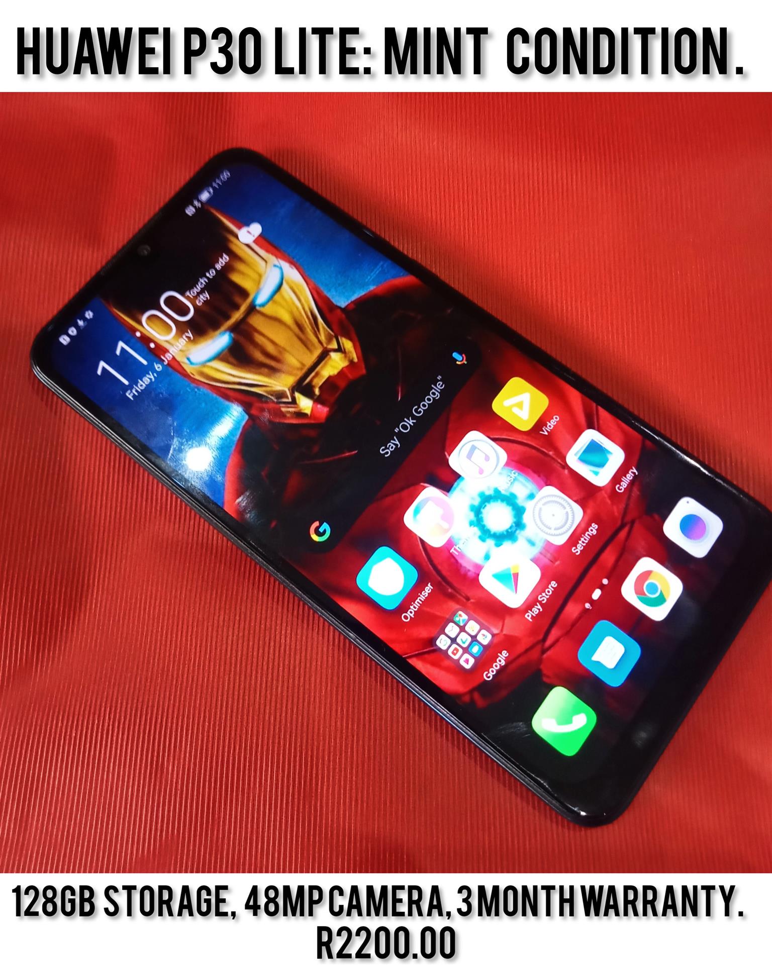 Cellphone Huawei P30 lite for sale in mint condition,128GB storage,4GB RAM,48MP triple camera, comes with a charging cable, headphones, charging block,pouch and a 3 month warranty. R2200.00