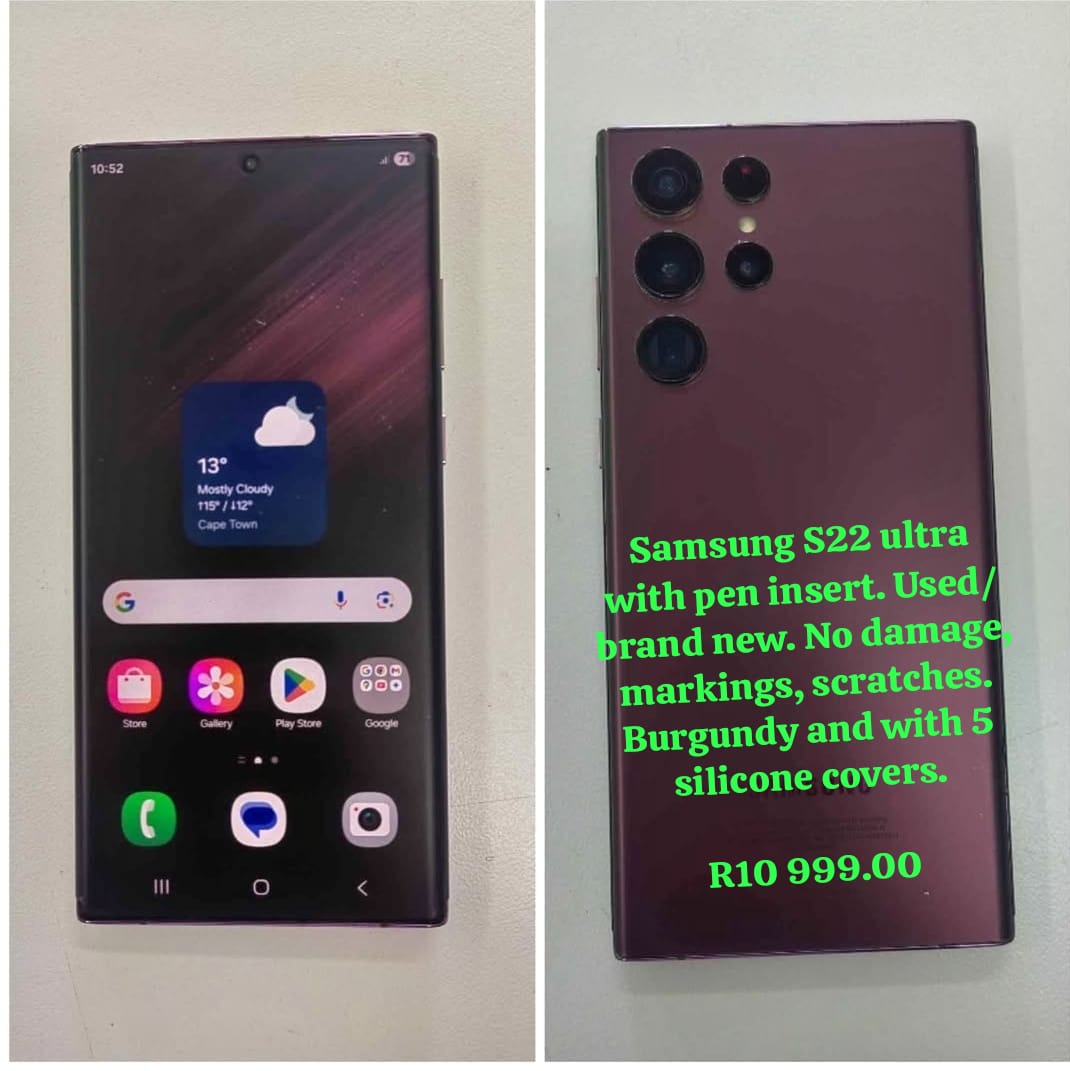 Samsung S22 ultra with pen insert. Used/still brand new. No damage, markings, or scratches. Burgundy colour and Comes with 5 silicone covers.