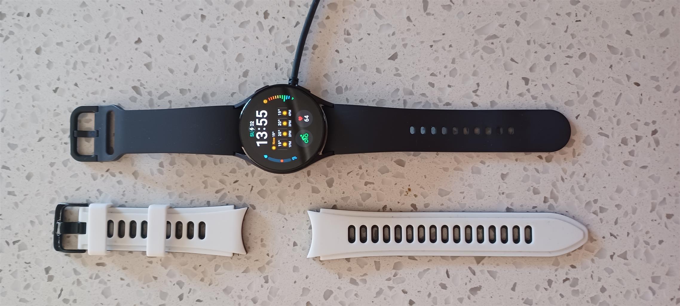Samsung Galaxy Watch 4 with wireless charger cradle and extra band.