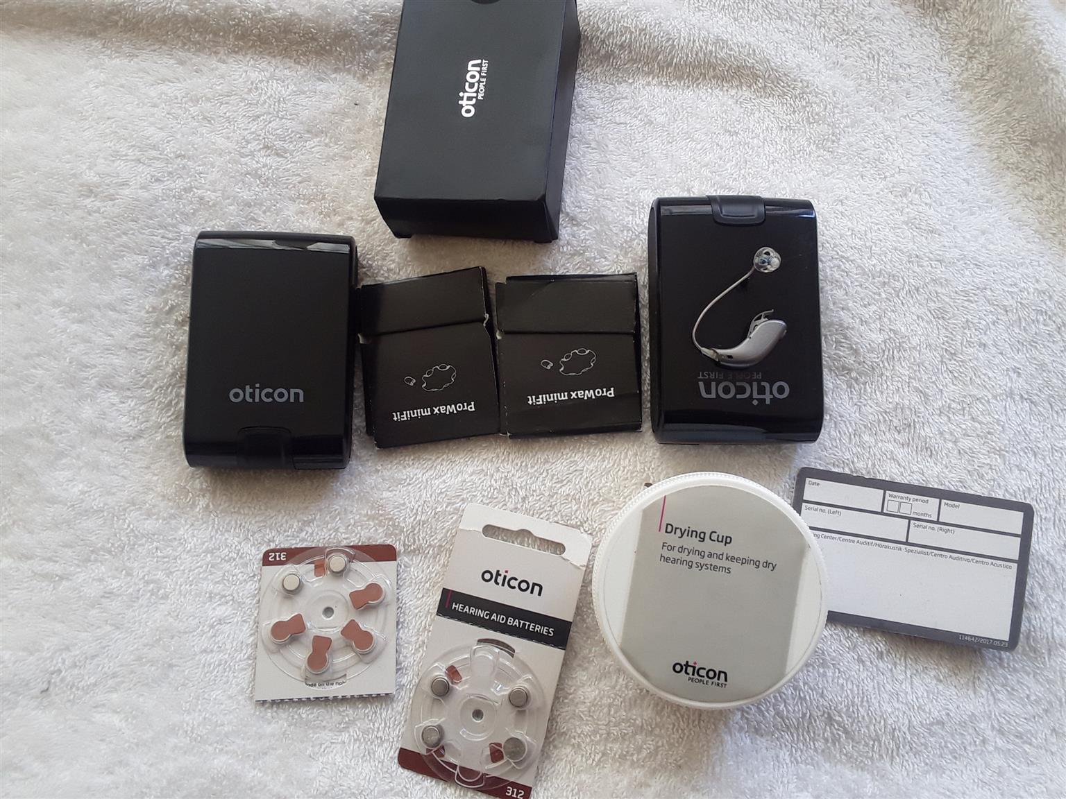 Otticon hearing aid for both ears,it comes with a set of betteries and a dry box.You can re programme it at your own medical practitioners for better use.