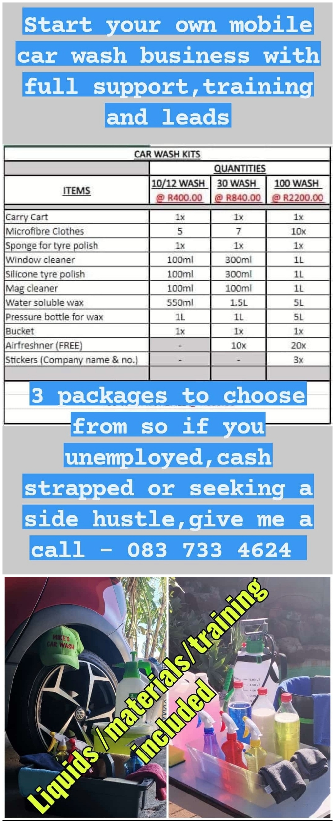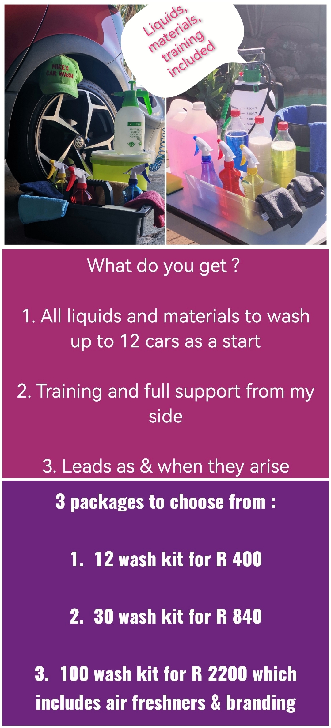 Start your own mobile car wash business from R 400 which includes all liquids and materials to wash up to 12 cars as a start. I provide training, support and leads