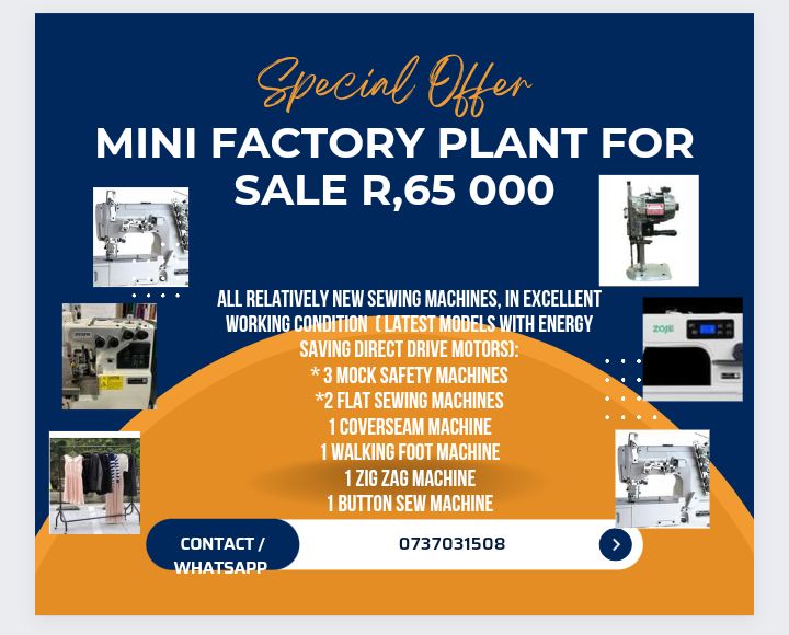 All Industrial Sewing machines in Excellent work conditions, new models with energy saving direct drive motors. Flat, Mock safety, Coverseam and Cutting machine. Excellent startup set.