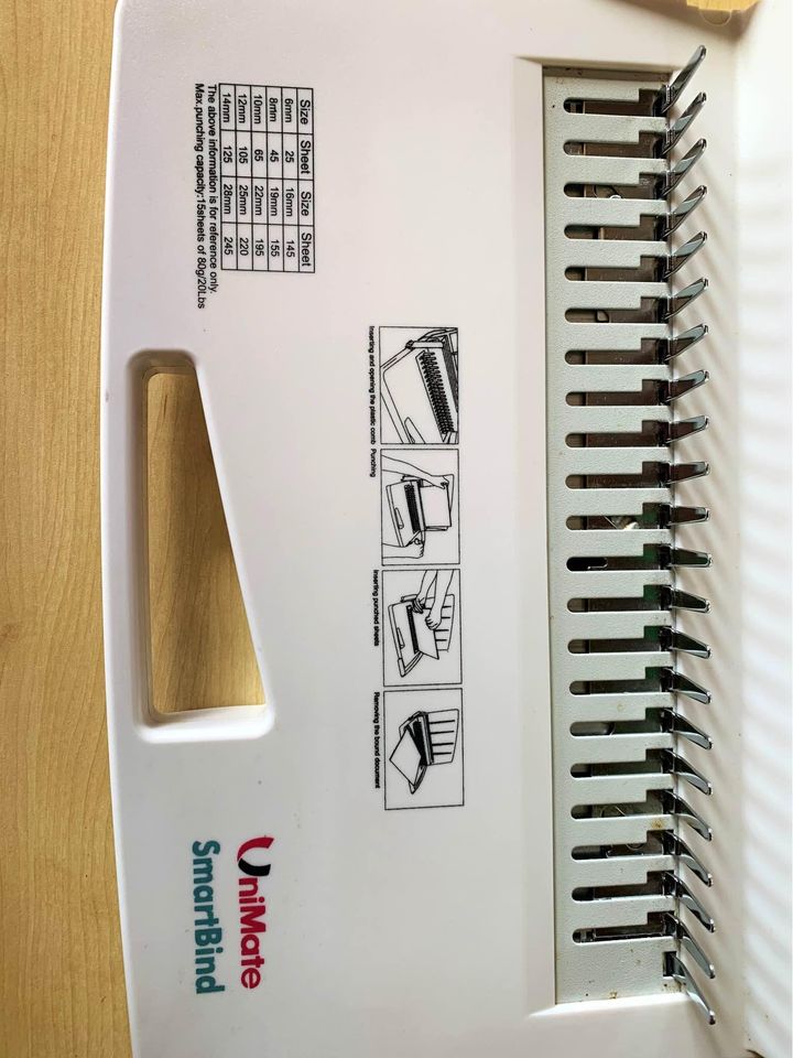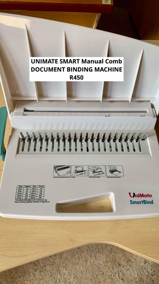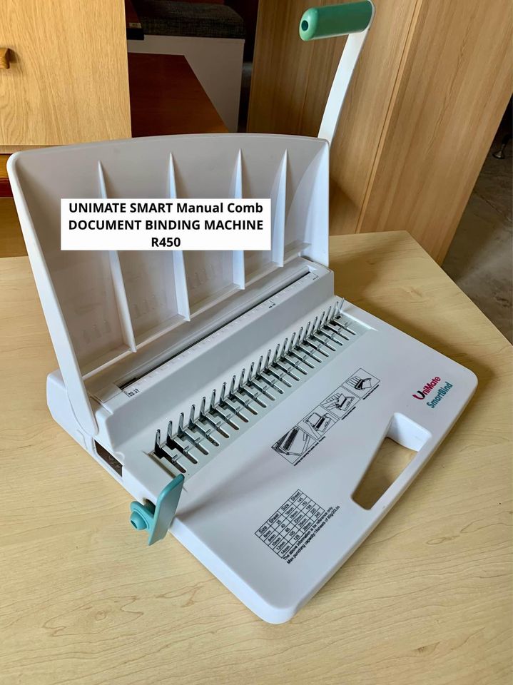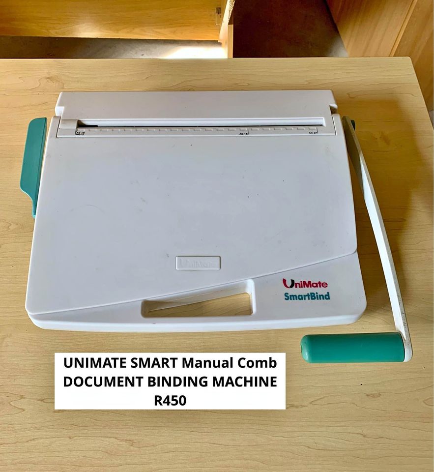 OFFICE DOCUMENT BINDING MACHINE UNIMATE SMART Manual Comb. More details:Intention - For SalePrice - 450Region - Eastern CapeCity - Ibhayi