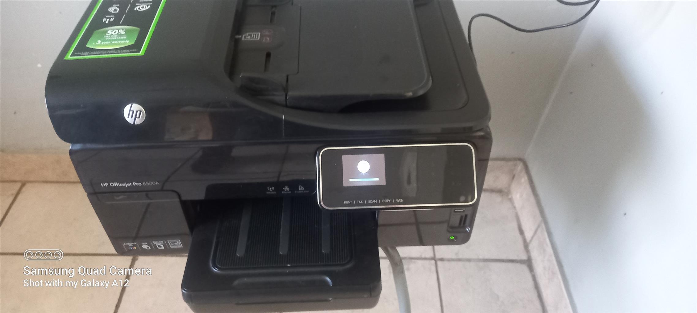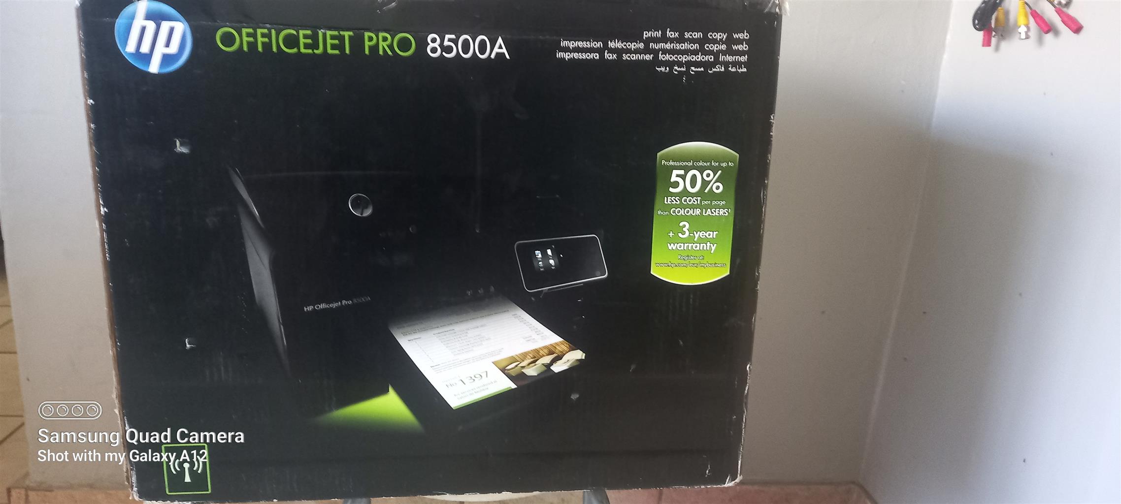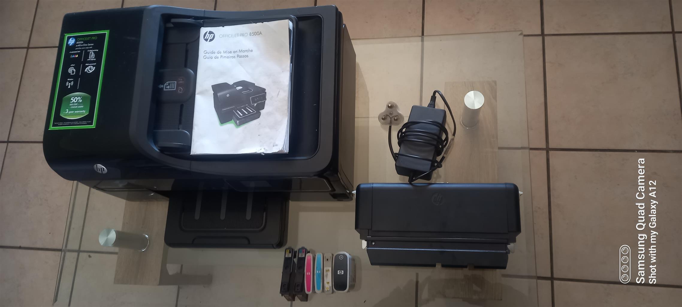 The Company that I was working for retrenched all of the staff at the end of the year. The office staff were give some of the equipment that was used. I was given this HP Officejet 8500A. I came complete in it's Original box with it's manual, Full compliment of Inkjet cartridges, 2x Paper feeders Back/Front, Charger. I have used it since with no problems howeve the Black & Yellow cartridge is almost empty and needs replacement but the full Color cartridges are still okay. I have another Laser Printer which I use and hence decide to sell this HP Officejet. This system is a plug and play once the network cable has been pluged in then you can download and install the full software feature suite for this device or just individual features as you need.