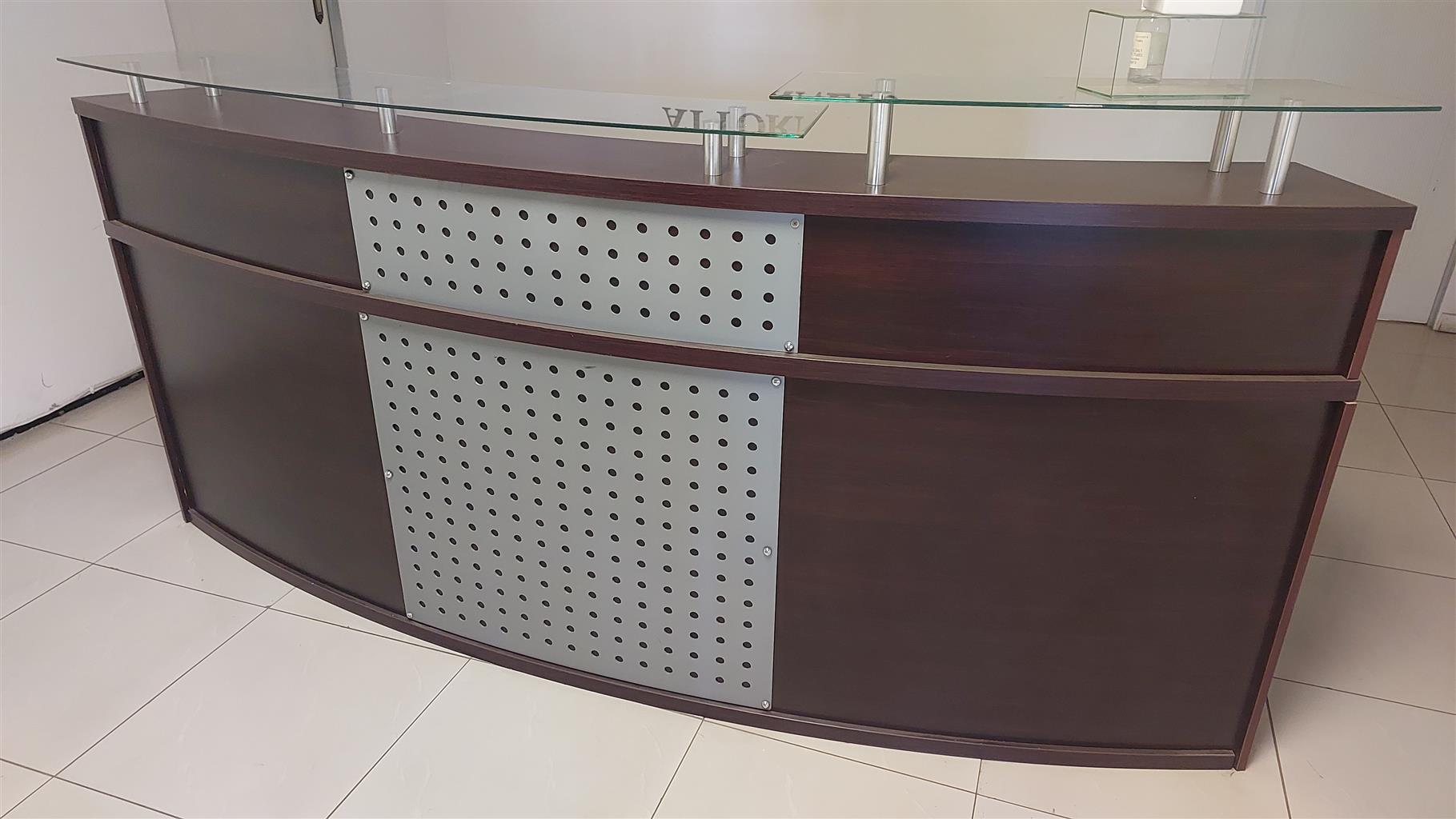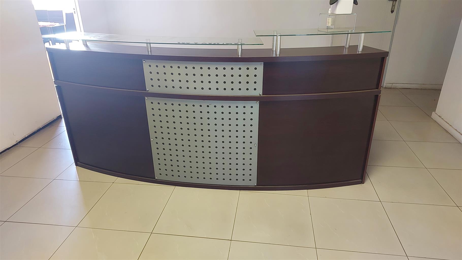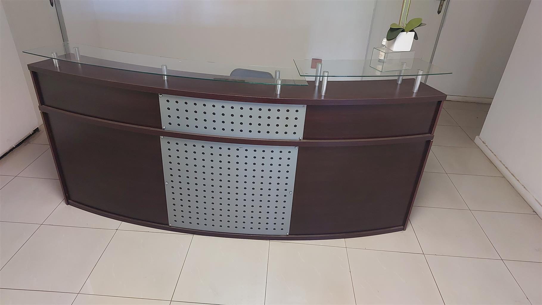 Beautiful large reception desk with glass. Good condition. Goes for around R15 000. Take it for 3k
