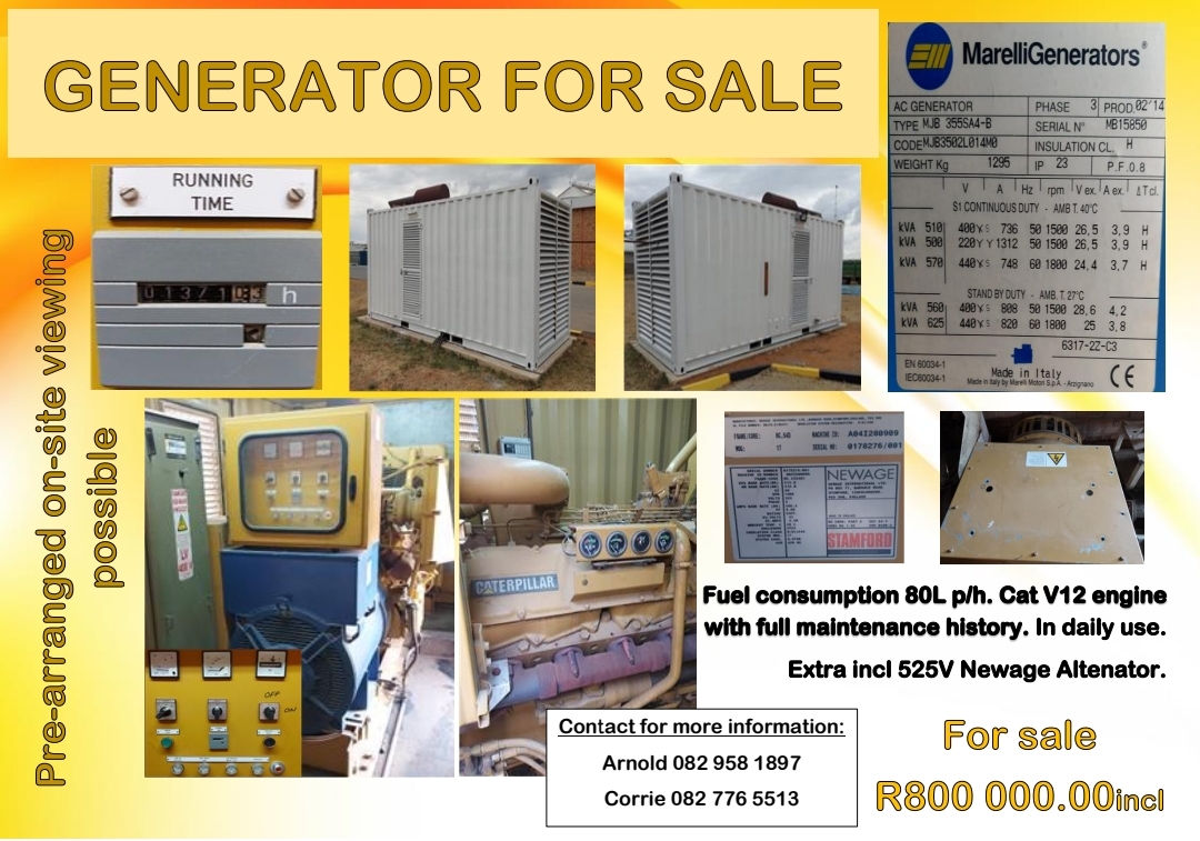 Fuel consumption 80L p/h. Cat V12 engine with full maintenance history. Extra includes 525V Newage Altenator. In daily use. For sale - R800 000.00. Contact Arnold/Corrie for more information