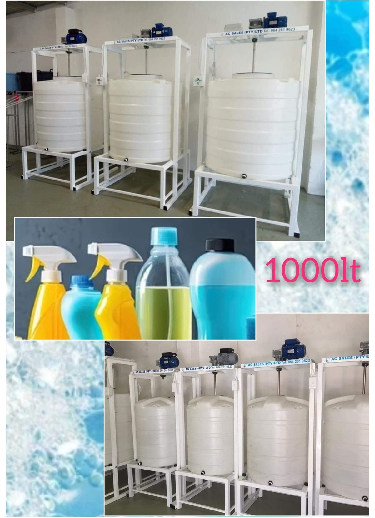 1000 liter detergent mixing machine, industrial unit, stainless steel shaft and mixing blades, includes formulation to manufacture 40 detergent products with details of suppliers for raw materials, or can be used for any other liquid products, , locally manufactured, countrywide and export delivery, full backup.