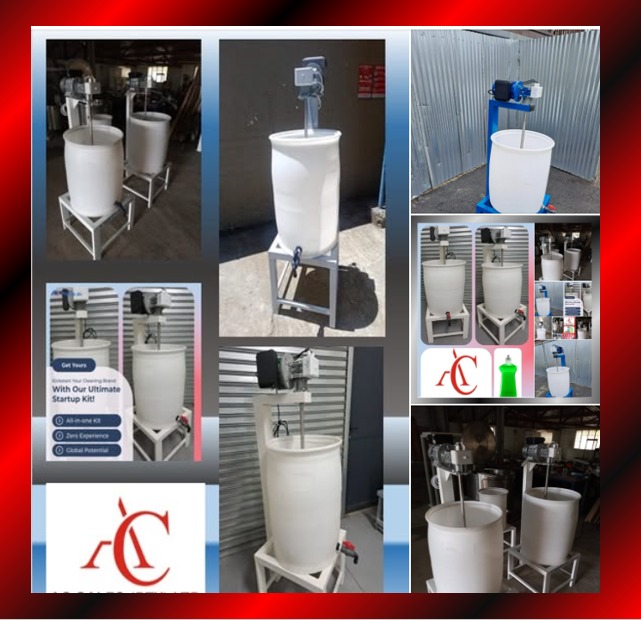 150 liter detergent mixing machine, industrial unit, stainless steel shaft and mixing blades, includes formulation to manufacture 40 detergent products with details of suppliers for raw materials, or can be used for any other liquid products, , locally manufactured, countrywide and export delivery, full backup.