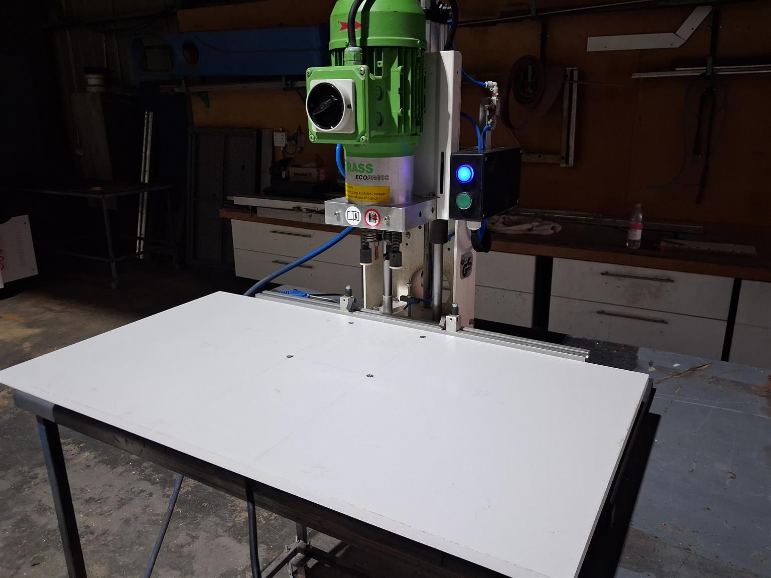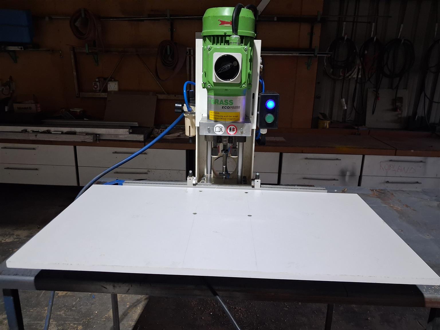 Drilling Machine for Concealed-Hinges - Grass Pneumatic Hinge Borer with Distance-Adjustment Flip-Stops for Accurate Drilling. This Quality Austrian-Built Machine has a Powerful 1.5 Kw, 230-Volt Single-Phase Motor. Complete with New Pneumatic & Electrical Control System and 35mm Industrial Cutting Bit.