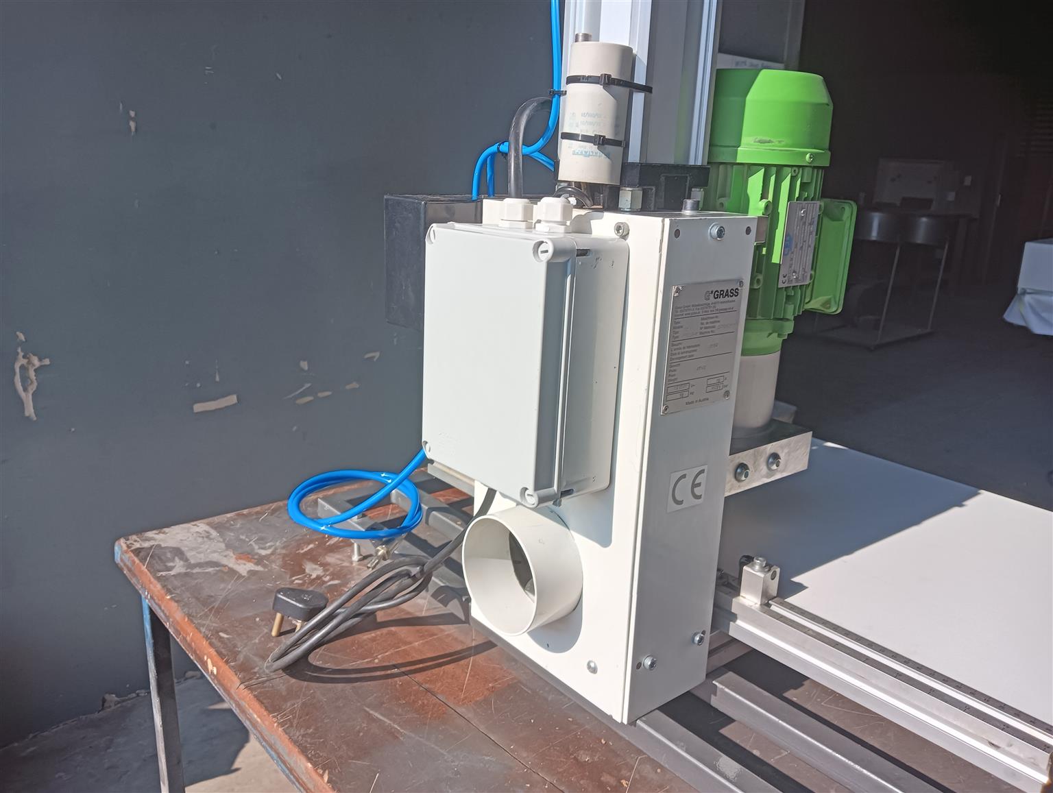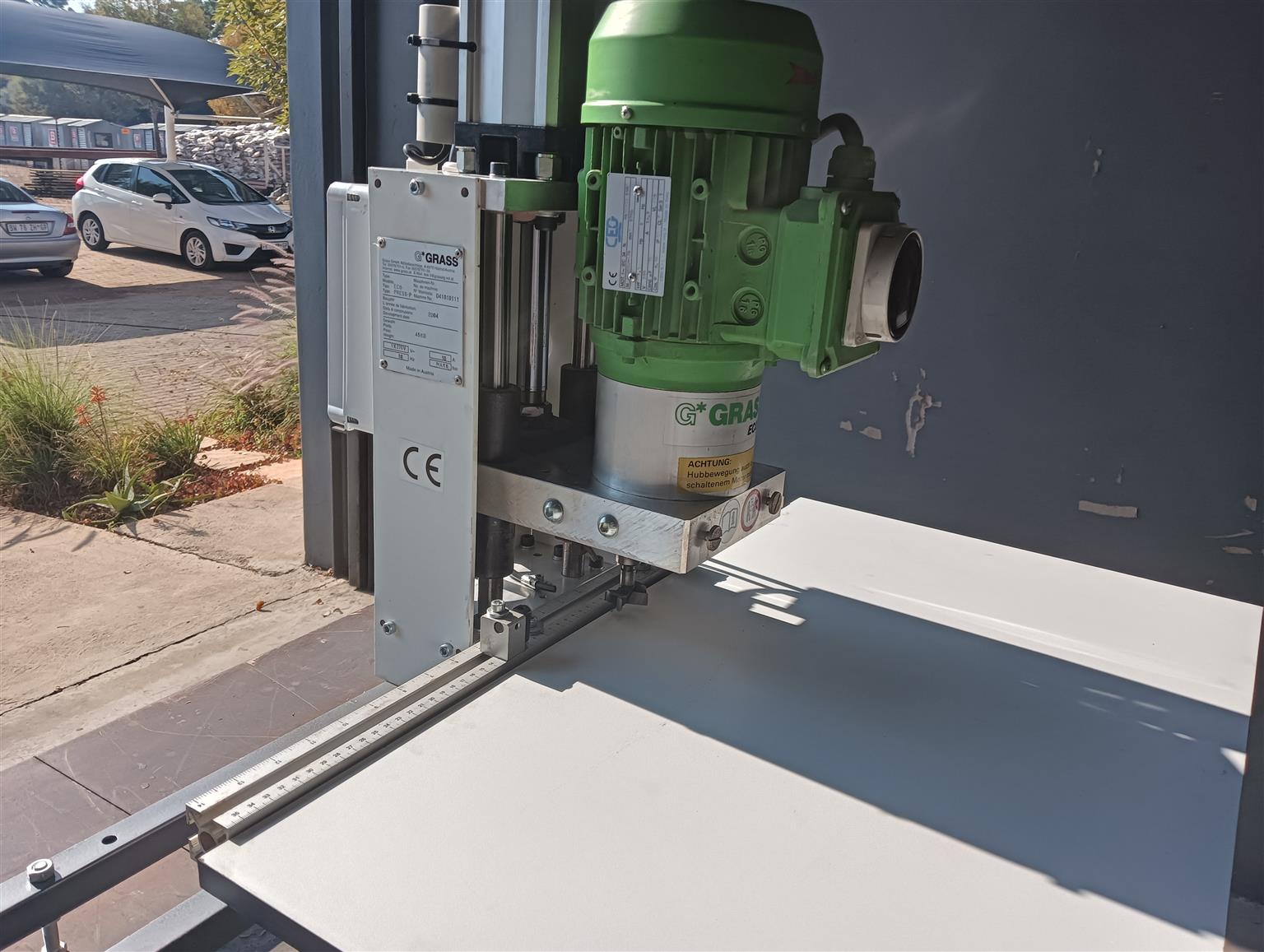 Drilling Machine for Concealed-Hinges - Grass Pneumatic Hinge Borer with Distance-Adjustment Flip-Stops for Accurate Drilling. This Quality Austrian-Built Machine has a Powerful 1.5 Kw, 230-Volt Single-Phase Motor. Complete with New Pneumatic & Electrical Control System and 35mm Industrial Cutting Bit.