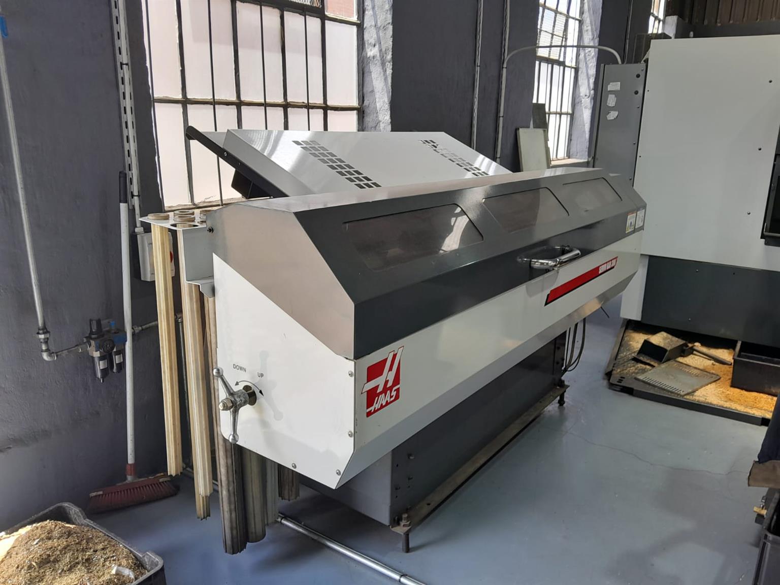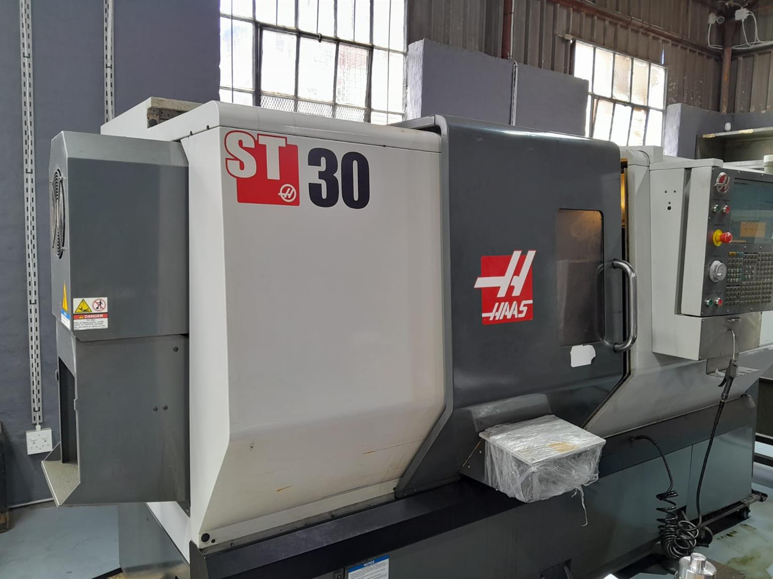 Haas ST30 CNC lathe for sale. Has ten inch chuck, 550mm working diameter, 800mm swing, 76mm bore size. Comes with Haas bar feeder.