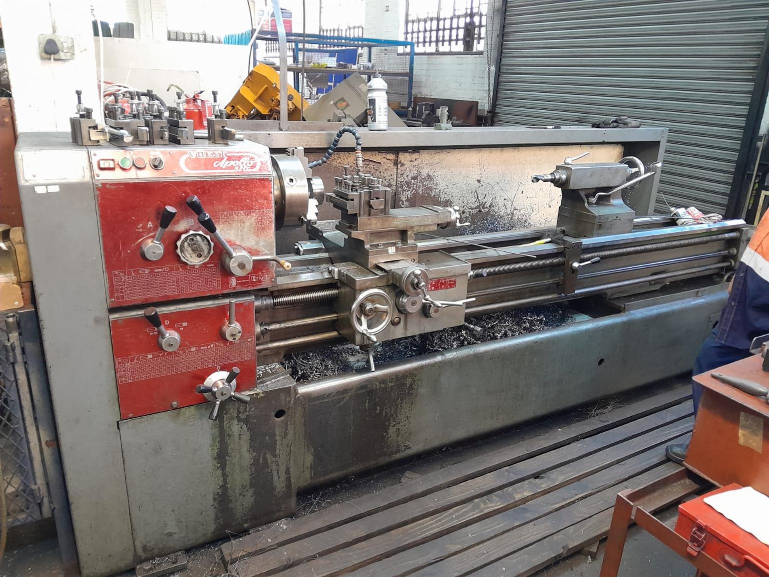 Voest Apollo 520 lathe for sale. Two meters between centers. 500mm swing over the bed, 360mm over cross slide. Has gap. 70mm bore size. 3 and 4 jaw chucks. Steady. Still in good condition.
