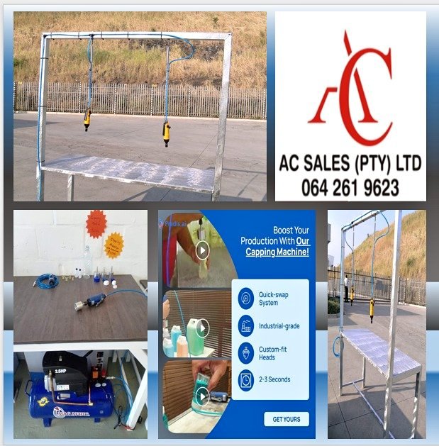 Please call/WhatsApp Pneumatic capping machine, unbelievable quality, aluminium head machined to suit your cap. Interchangeable heads for various cap sizes and available for any cap size, caps at 2-3 seconds per bottle. For operation video, please send a WhatsApp
