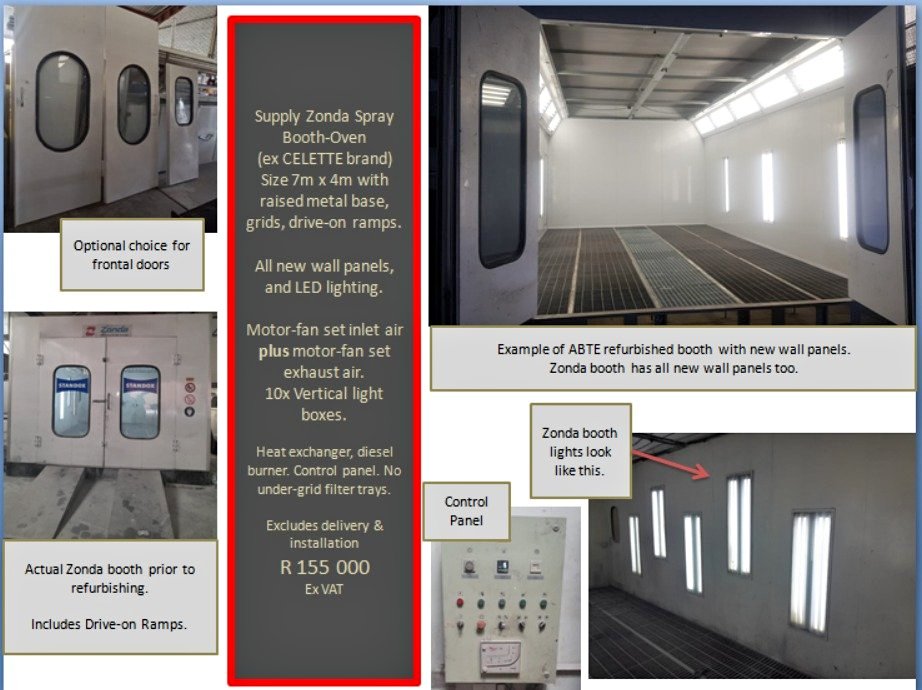 Optional choice for frontal doors. Includes drive-on ramps. Size 7m x 4m with raised metal base, grids, drive-on ramps. All new wall panels and LED lighting. Motor-fan set inlet air plus motor-fan set exhaust air. 10x vertical light boxes. Heat exchanger, diesel burner, Control panel. No under-grid filter trays.