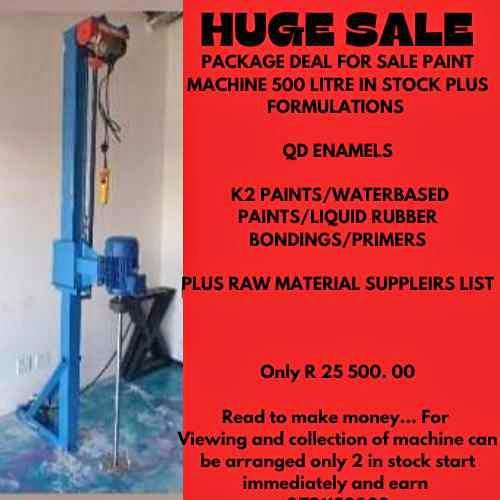Package deal Machine plus Formulations immediate start up Machine in Stock R25 500.00 2k/ QD ENAMELS/ WATERBASED PAINTS/Liquid Rubber/Bonding AND PRIMERS. Suppleirs info can also be suppleid