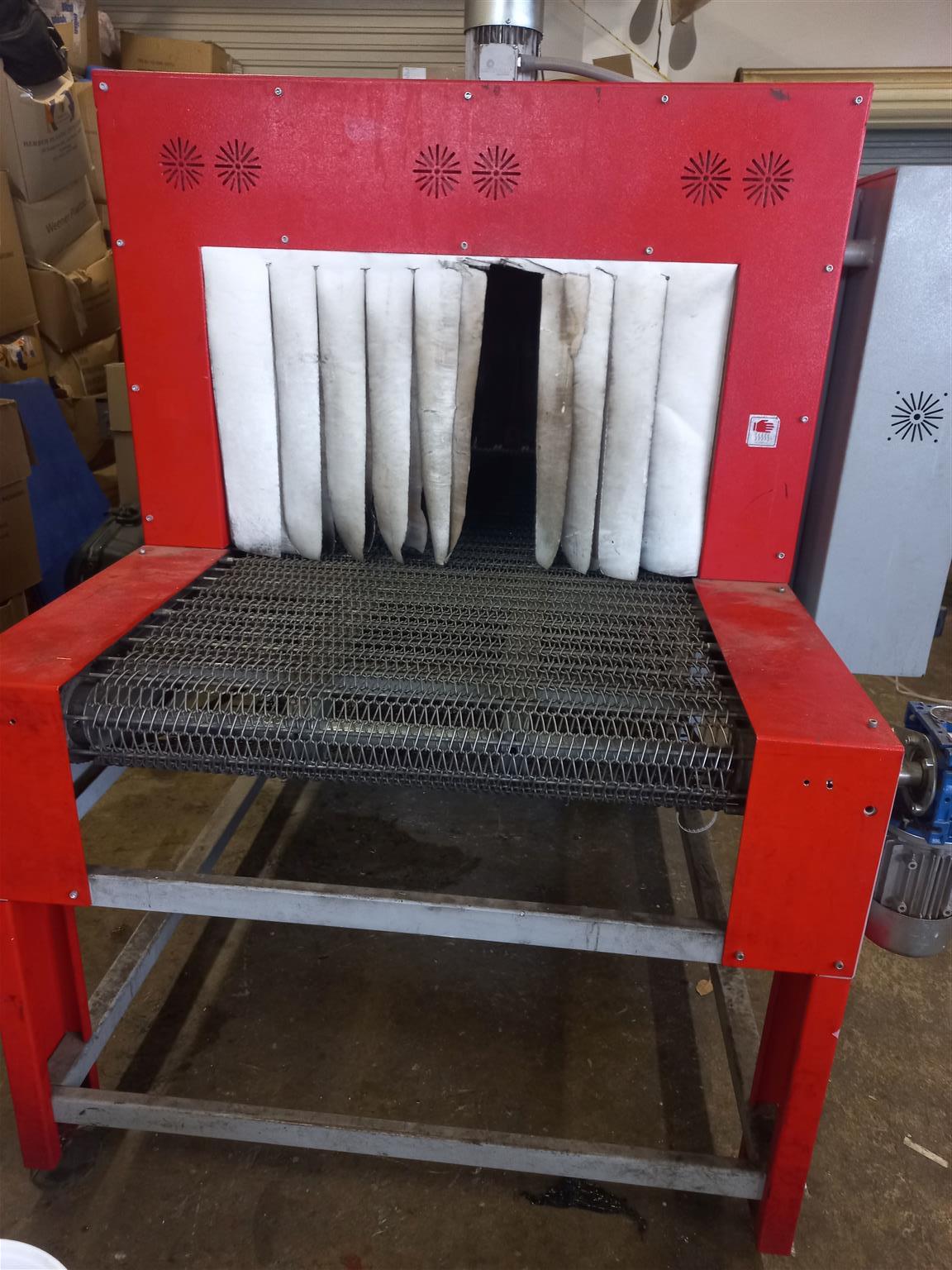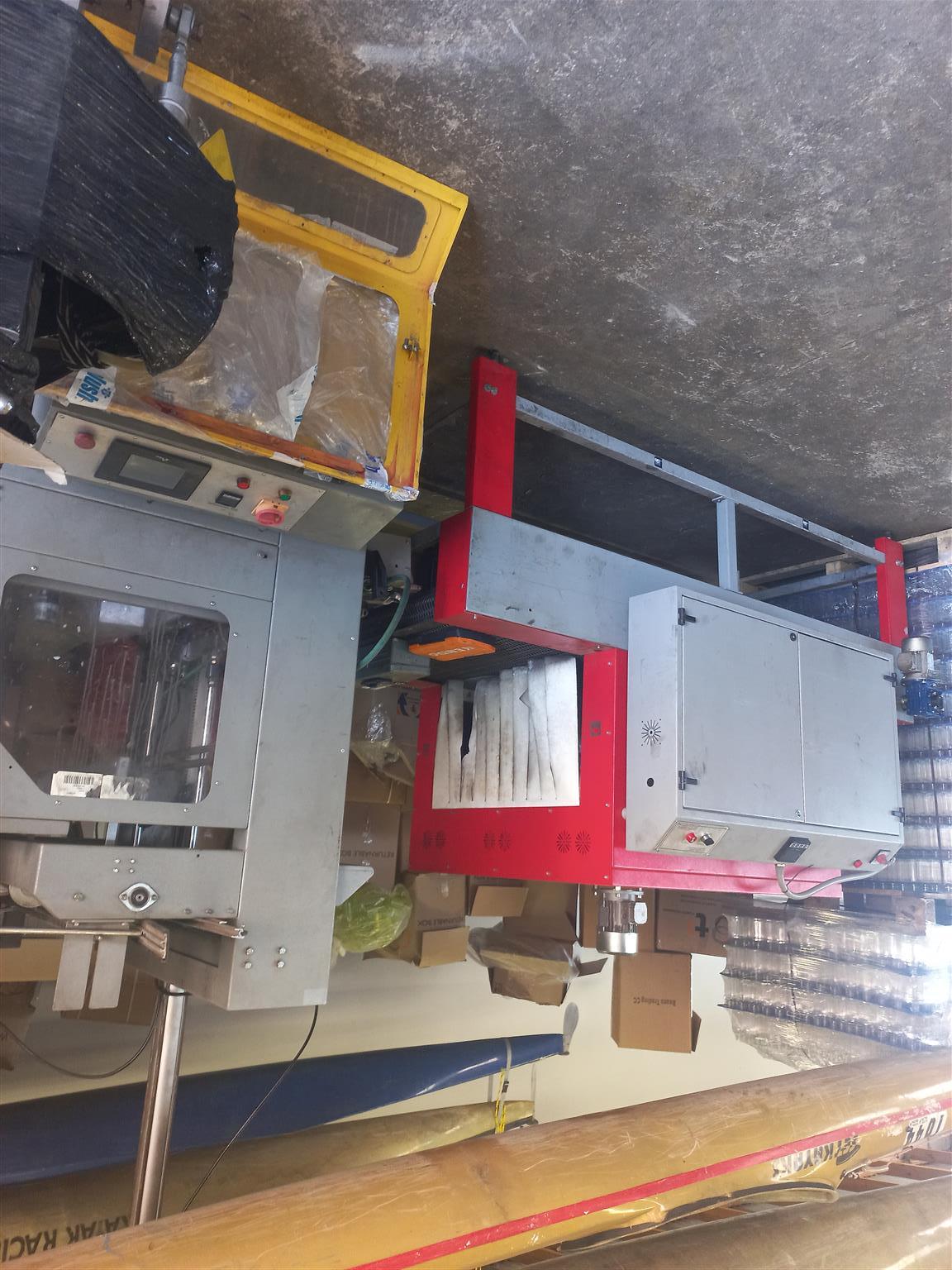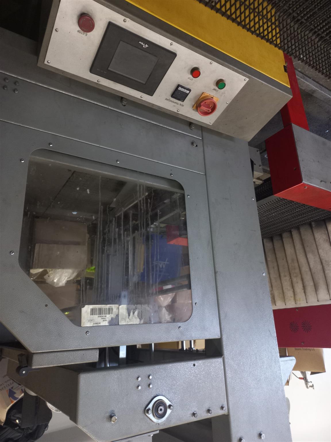 Fully automated shrink tunnel with plastic cutoff and heat tunnel combined.