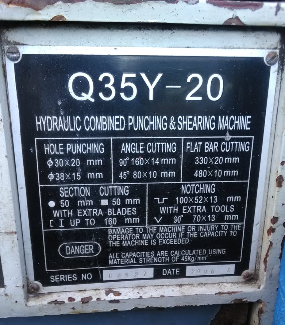 Iron Worker 36 tonModel Q35Y-20160 x160 x 14 mm angle330 x 20 mm plate bar30 mm Dia x 20 mm plateMachine in good working orderContact John