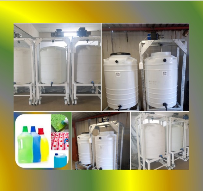 500 liter detergent mixing machine with removble base and tank, industrial unit, stainless steel shaft and mixing blades, includes formulation to manufacture 40 detergent products with details of suppliers for raw materials, or can be used for any other liquid products, , locally manufactured, countrywide and export delivery, full backup.