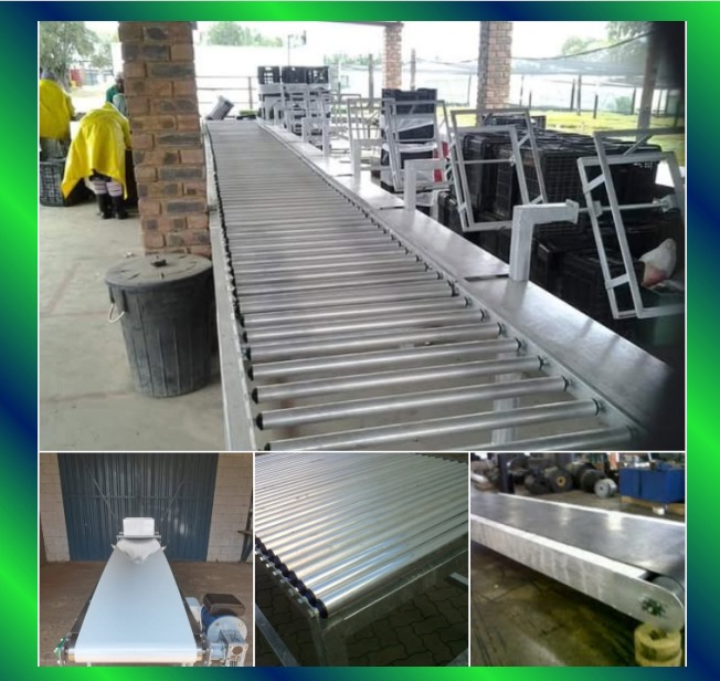 Belt conveyors, incline or decline option, widths and thicknesses. We manufacture anything from food grade belt to 10mm thick rubber belts. Bodies of the machines designed according to specification and applications. Manufactured in mild steel and hot dipped galvanized, or from stainless in steel in various grades including food grade 316. Units available in 220 volts or 380 volt systems, with or without speed control units. We also rebuilt existing conveyor systems.