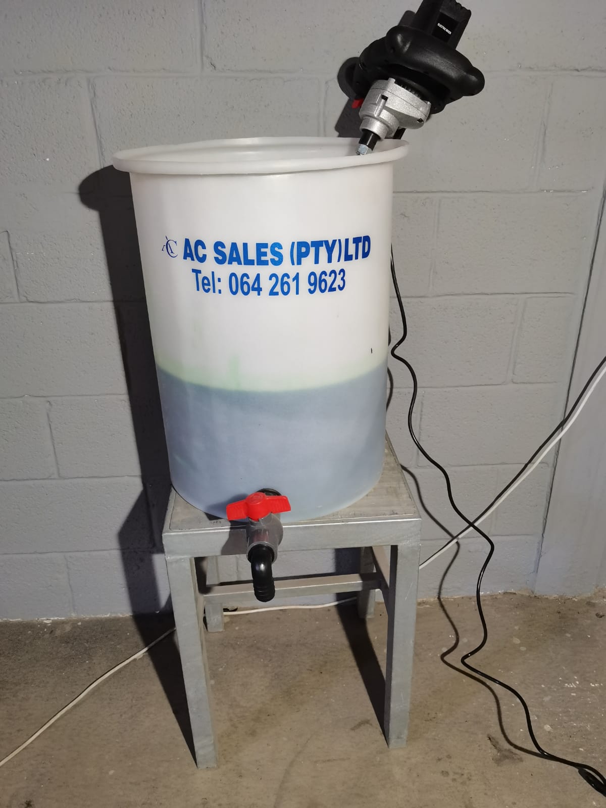 ONE ONLY, Detergent mixing machine, handheld, with 50 litre tank and stand for the tank (allows filling directly into containers up to 25 litres, PLUS get a free formulation book with 40 formula (and includes suppliers details for raw materials) WhatsApp for a demo video mixing dishwashing liquid