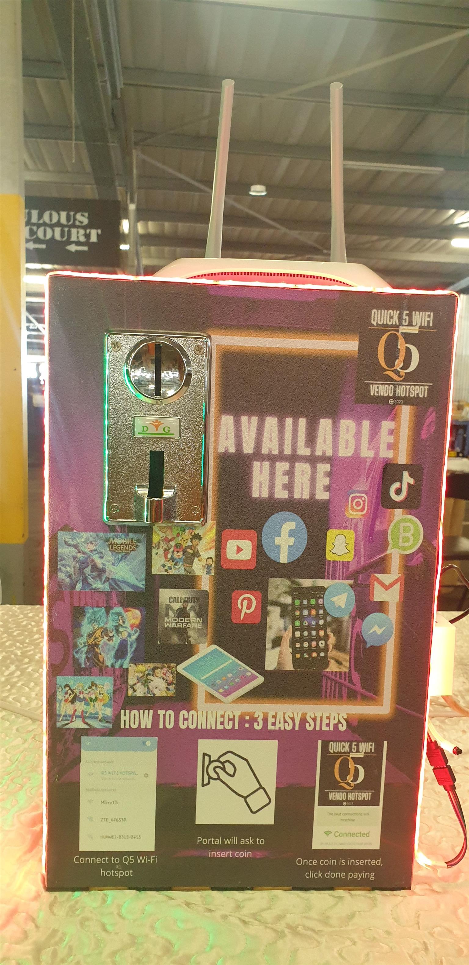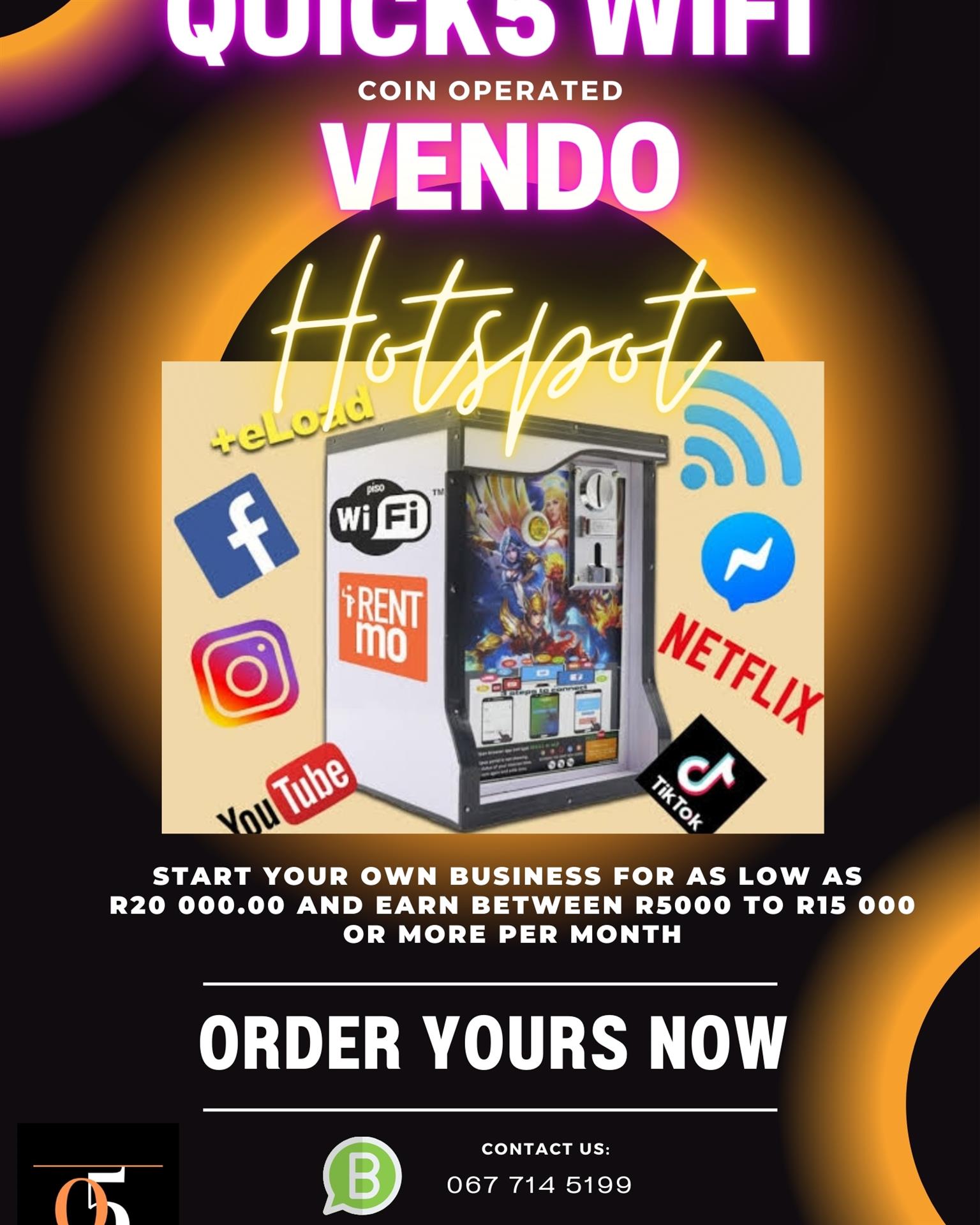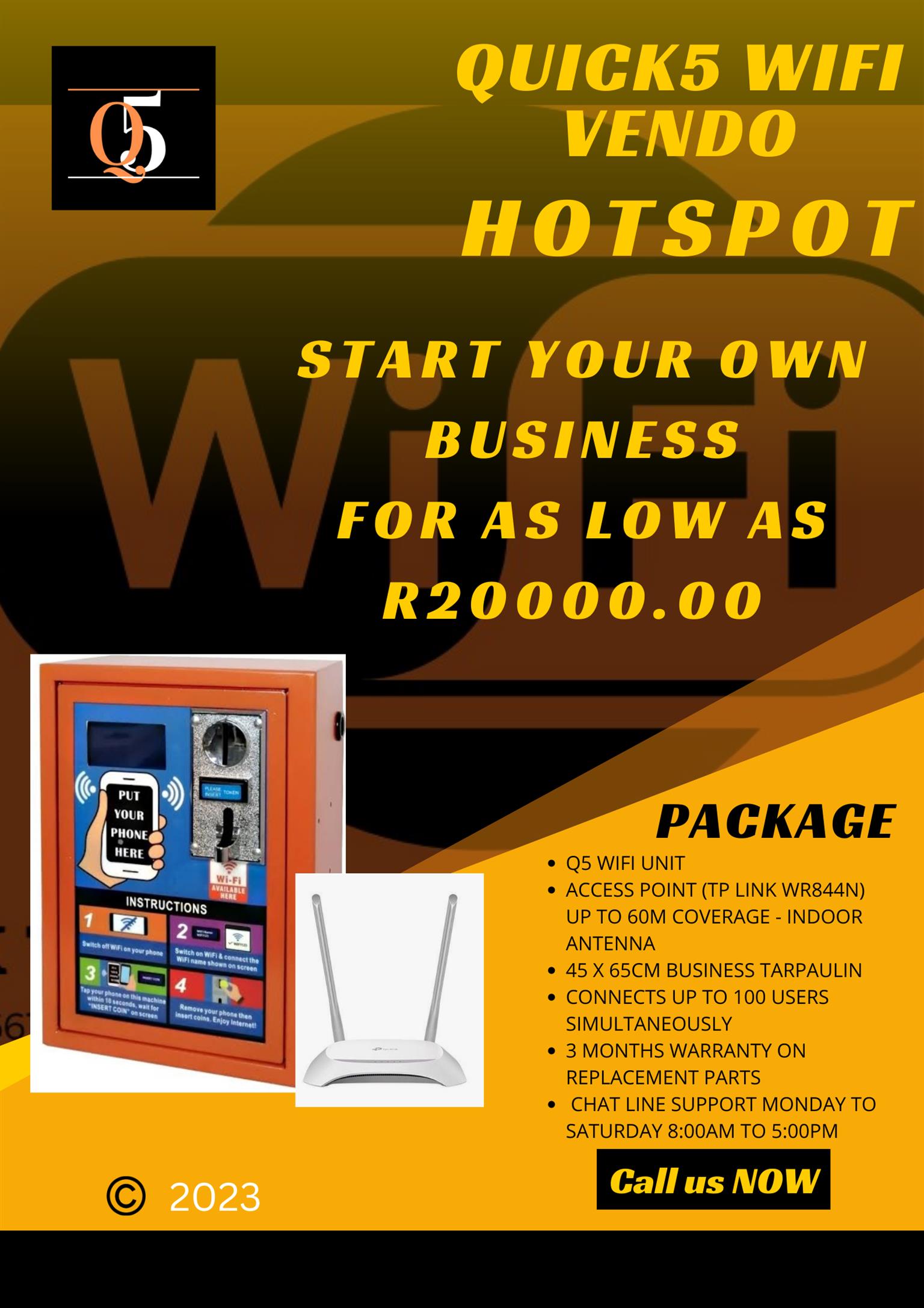 The Q5 Vending Hotspot Business Unit is an opportunity for entrepreneurship, using existing Wifi/fibre, and a smartphone. The Q5 Wifi Vendo Hotspot Business Unit allows you to be your own boss. Alternatively, you could generate ongoing revenue through sales, thus reducing unemployment, restoring dignity and uplifting our Community.