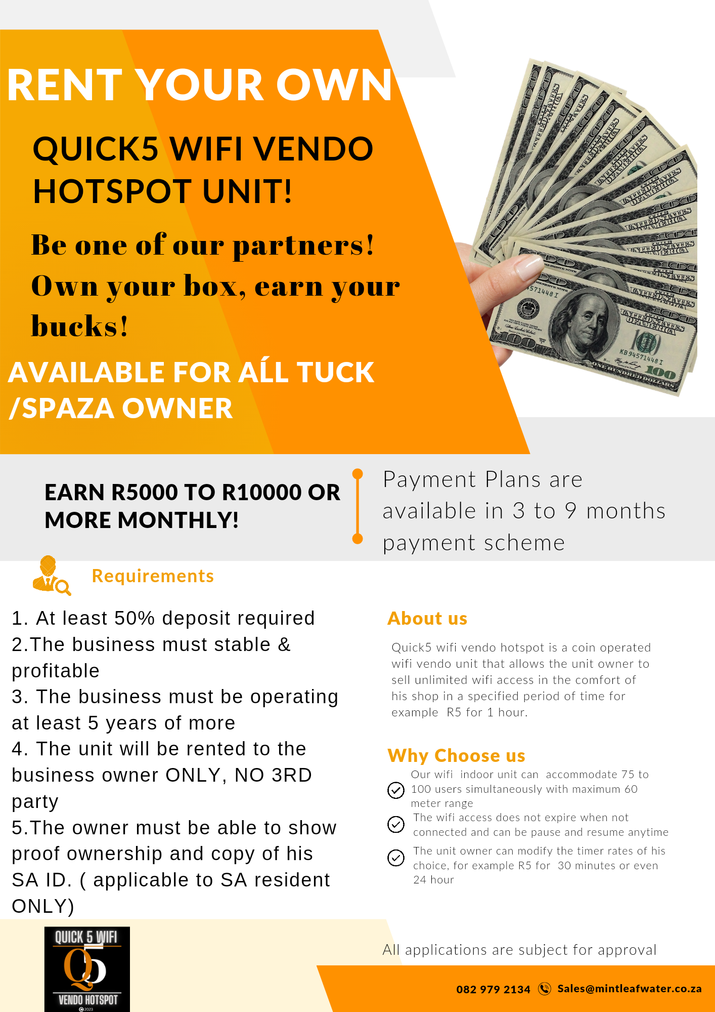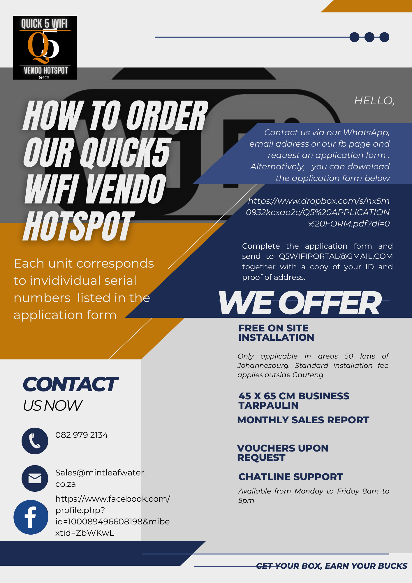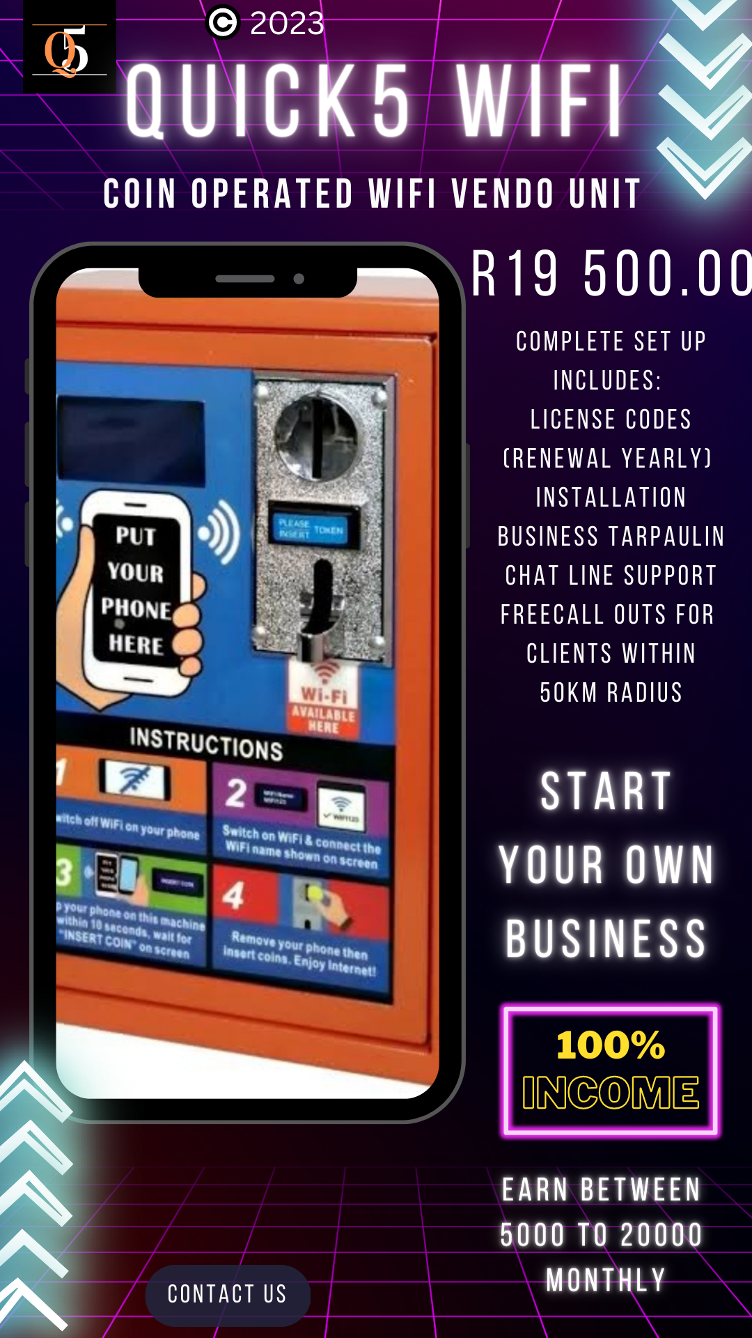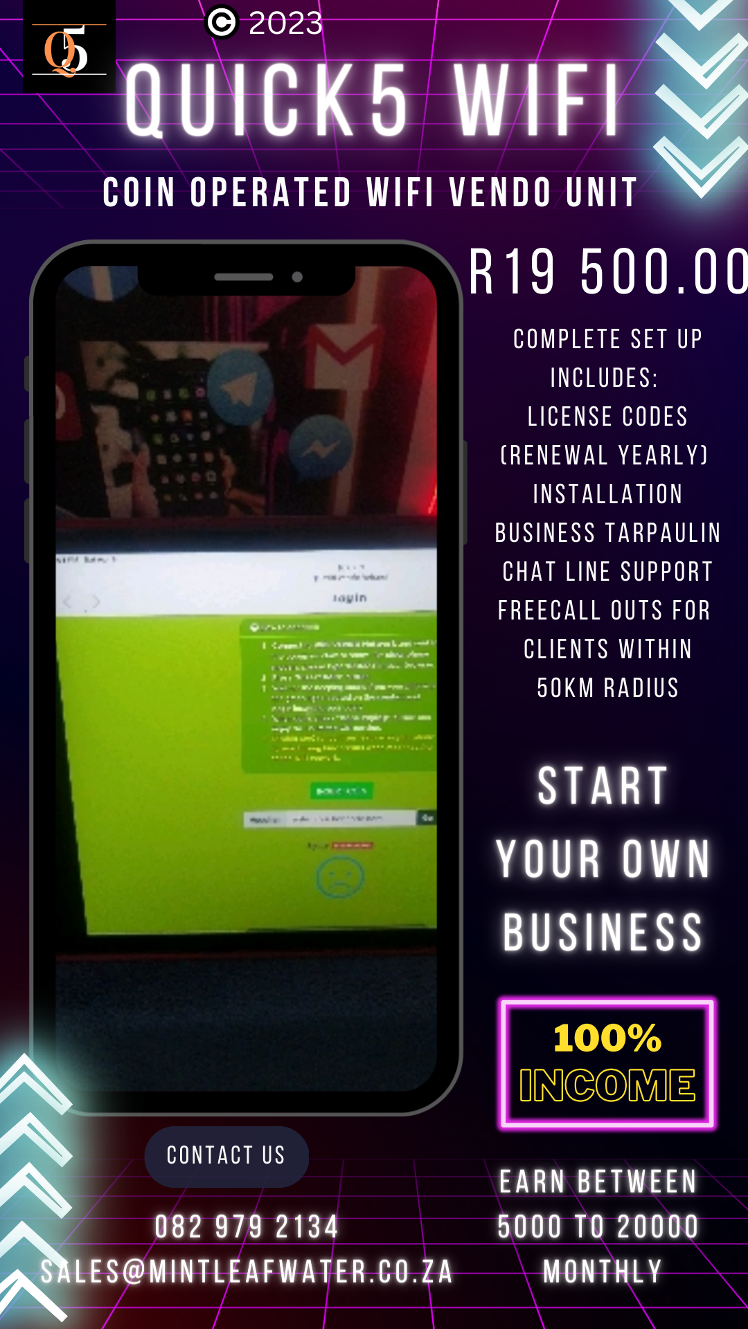 The Q5 Vending Hotspot Business Unit is an opportunity for entrepreneurship, using existing Wifi/fibre, and a smartphone. The Q5 Wifi Vendo Hotspot Business Unit allows you to be your own boss. Alternatively, you could generate ongoing revenue through sales, thus reducing unemployment, restoring dignity and uplifting our Community.