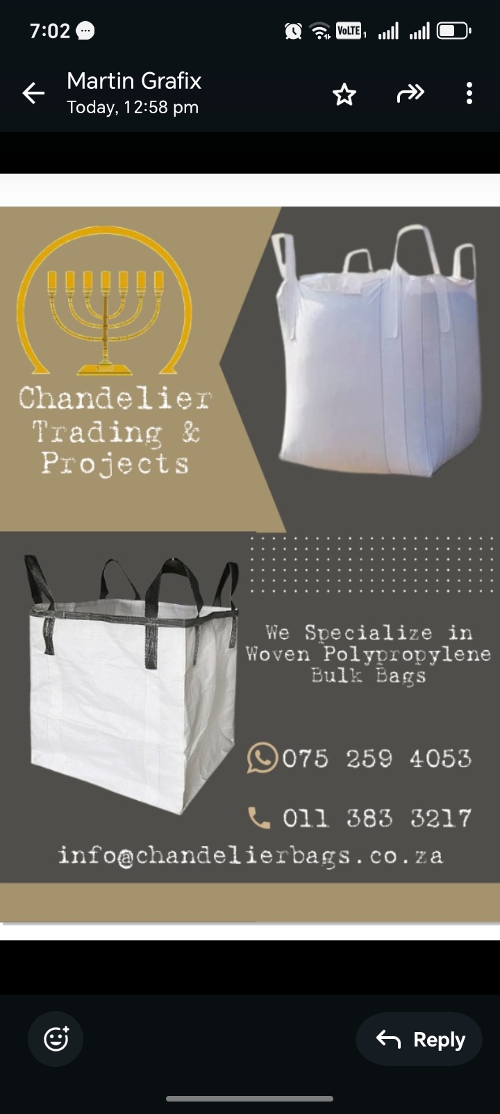 We sell New and Once Used Woven Polypropylene Bulk Bags suitable for industrial, minerals, agricultural and domestic use.