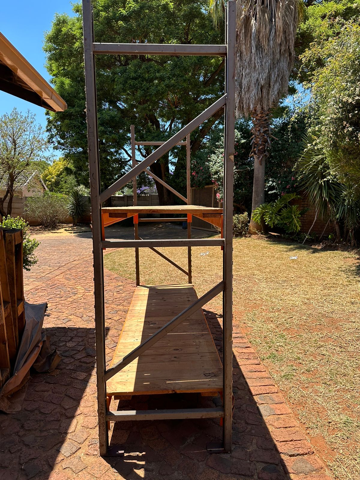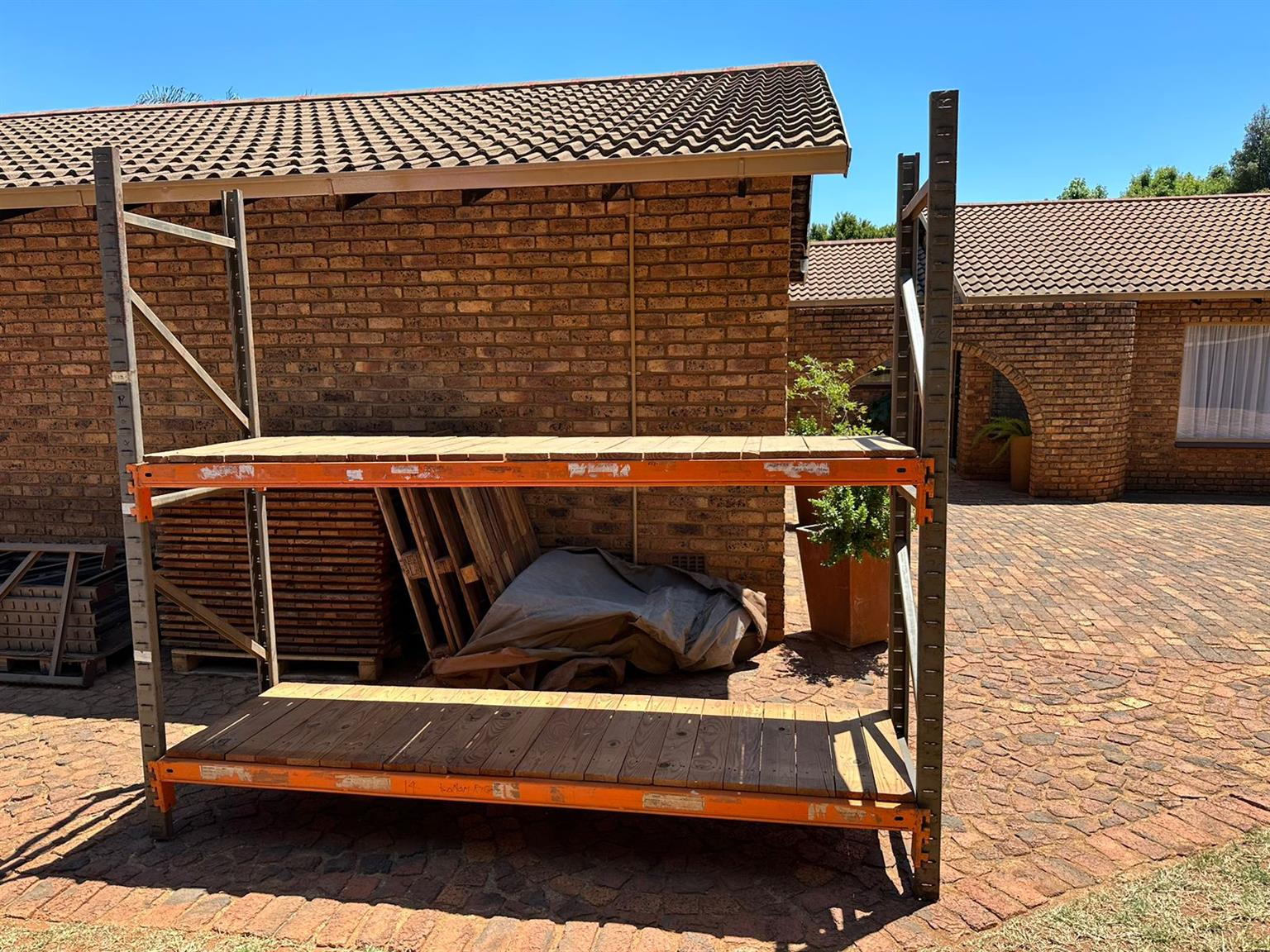 4 x Heavy duty shelving/racking with 3 wooden shelves. Length: 2.8 m, Width: 76 cm, Height: 2.45 m