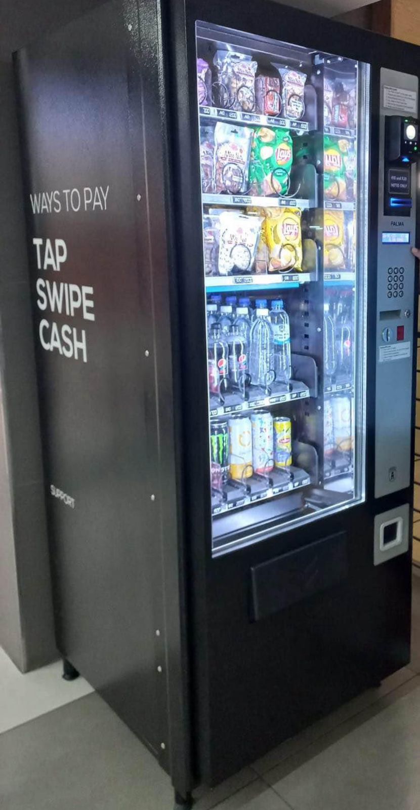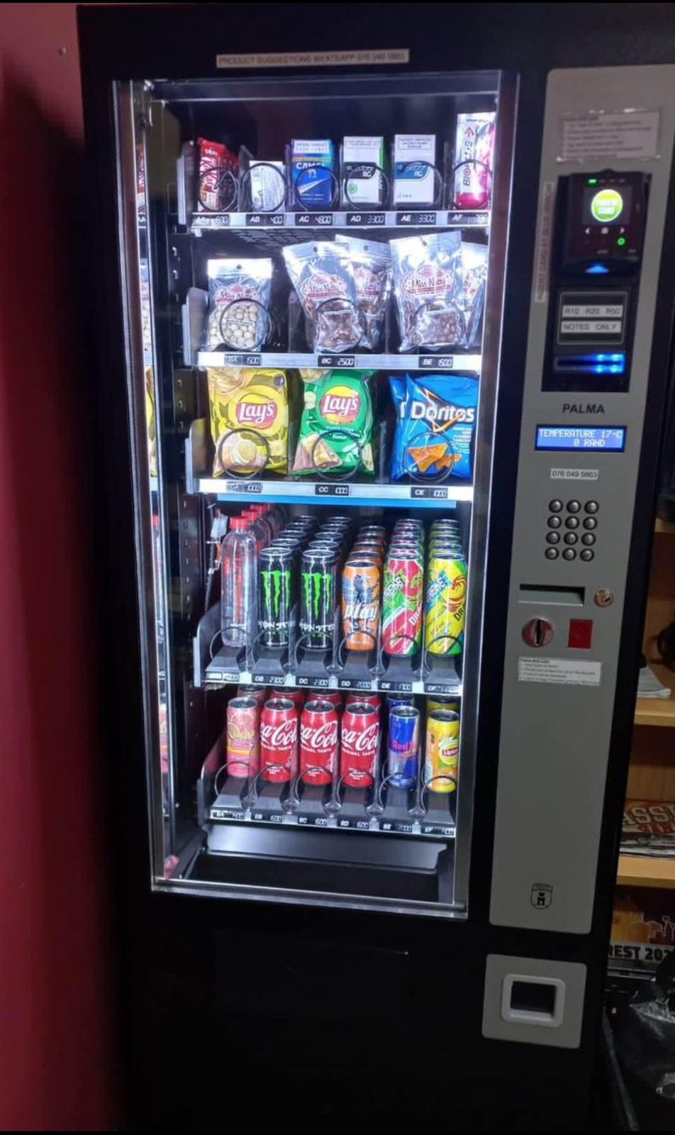 Palma Hz70 Vending Machine with card machine (Tap and Swipe) and takes Cash. Machine can take snacks and drinks, build in fridge function to keep beverages cold. Includes Current Contract at busy Office building.