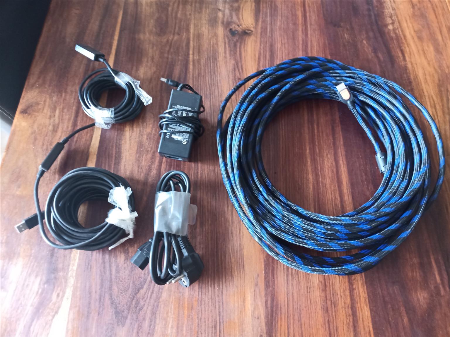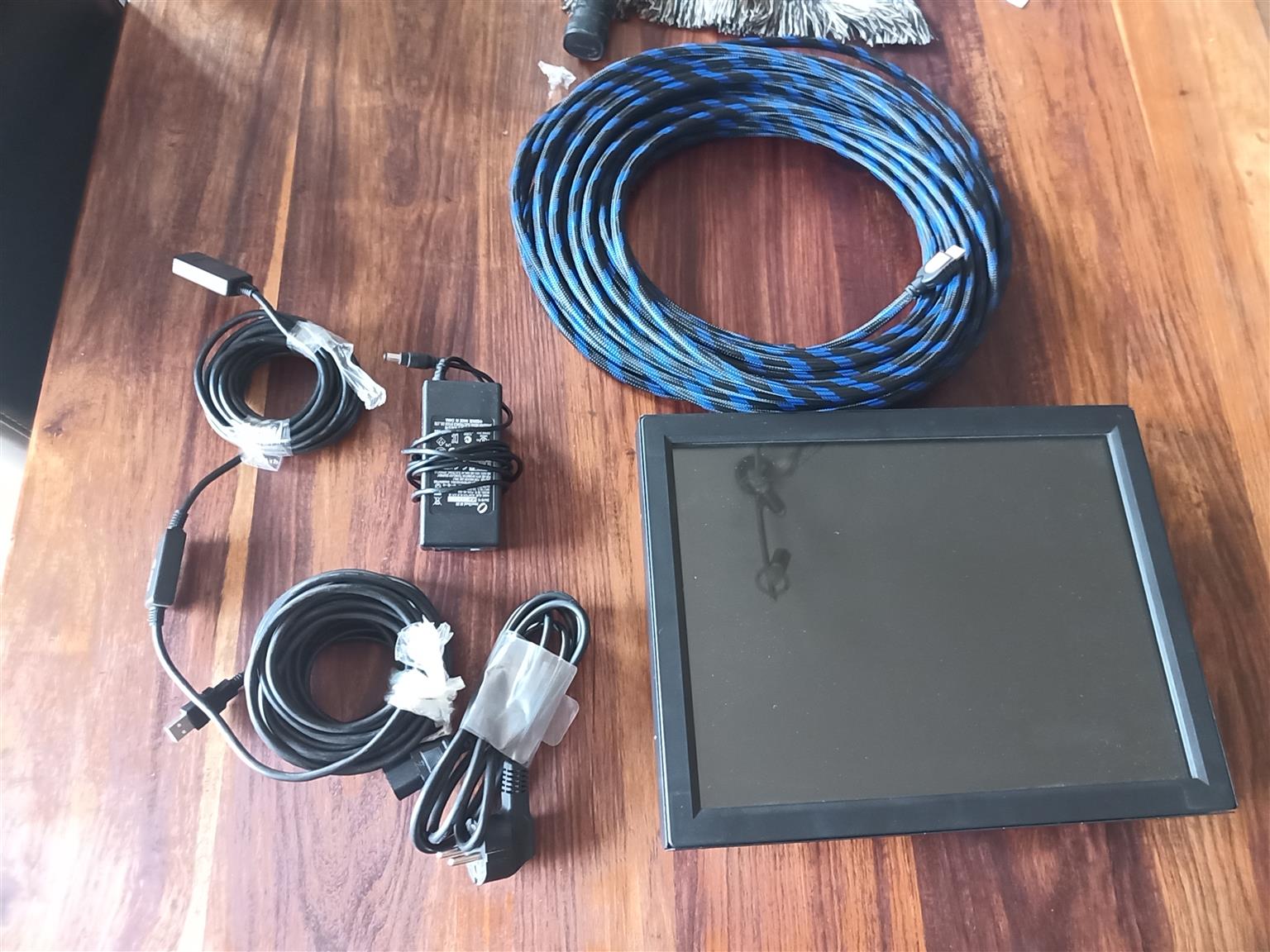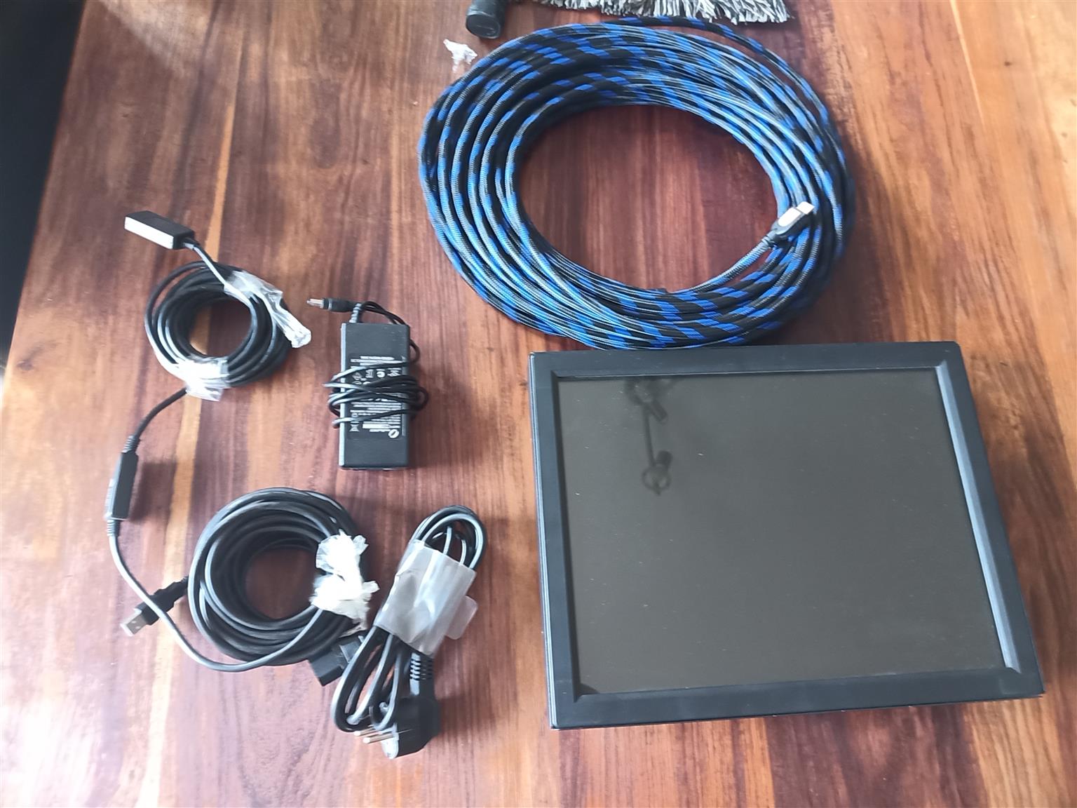 15" touch monitor, with extra length HDMI and USB cables, power supply included. Screen works fine, with a change in house layout this is no longer needed