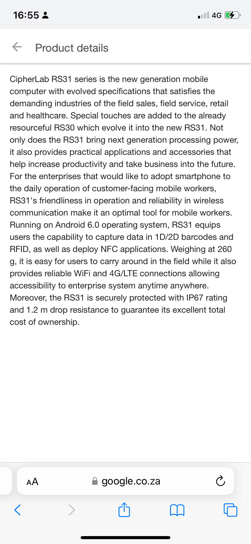 CipherLab RS31 series is the new generation mobile computer with evolved specifications that satisfies the demanding industries of the field sales, field service, retail and healthcare. Special touches are added to the already resourceful RS30 which evolve it into the new RS31. Not only does the RS31 bring next generation processing power, it also provides practical applications and accessories that help increase productivity and take business into the future.