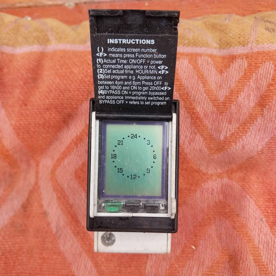 The programmable time switch can be used to automatically control pool pumps, lights, geysers, etc Simple setting of time and programs Multiple ON/OFF programs Improved 15 minute segments Graphical display on home screen of 24h program schedule Compact size