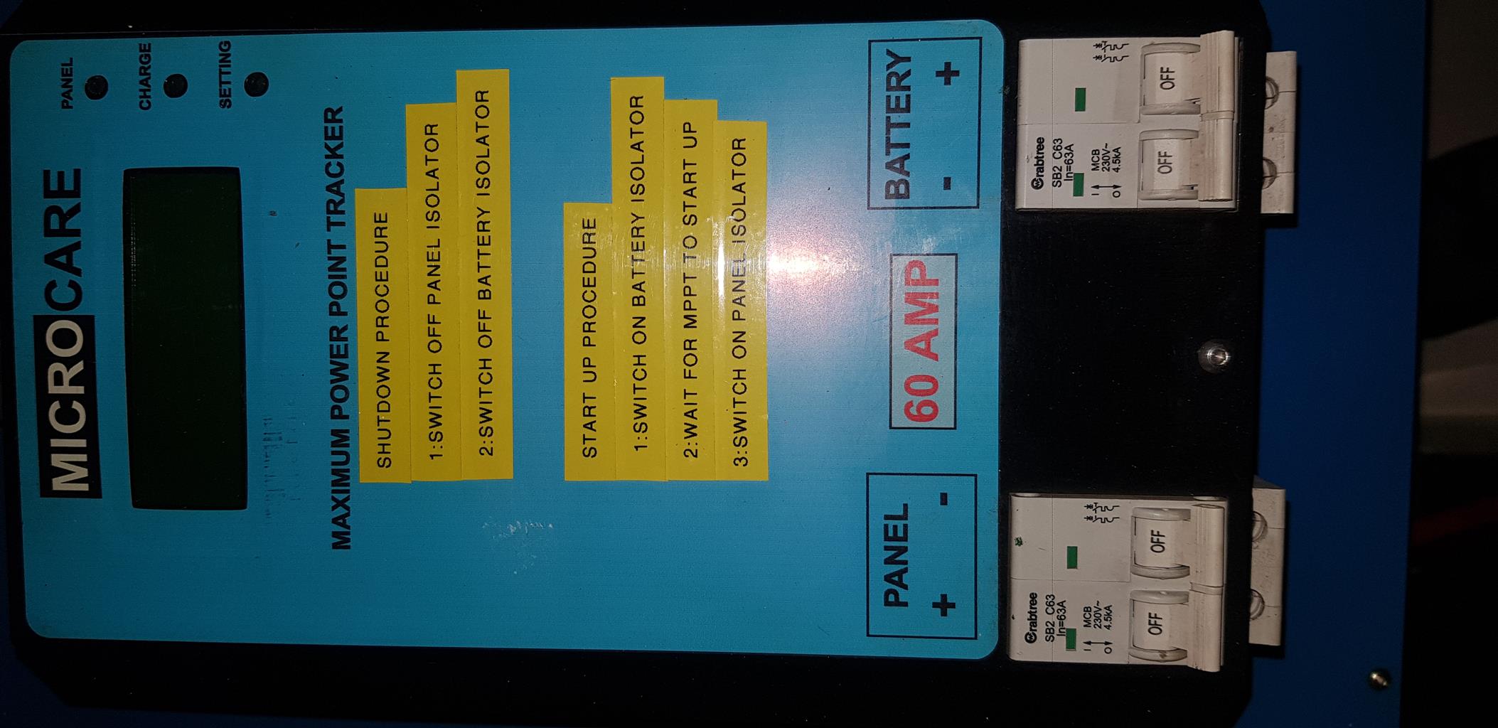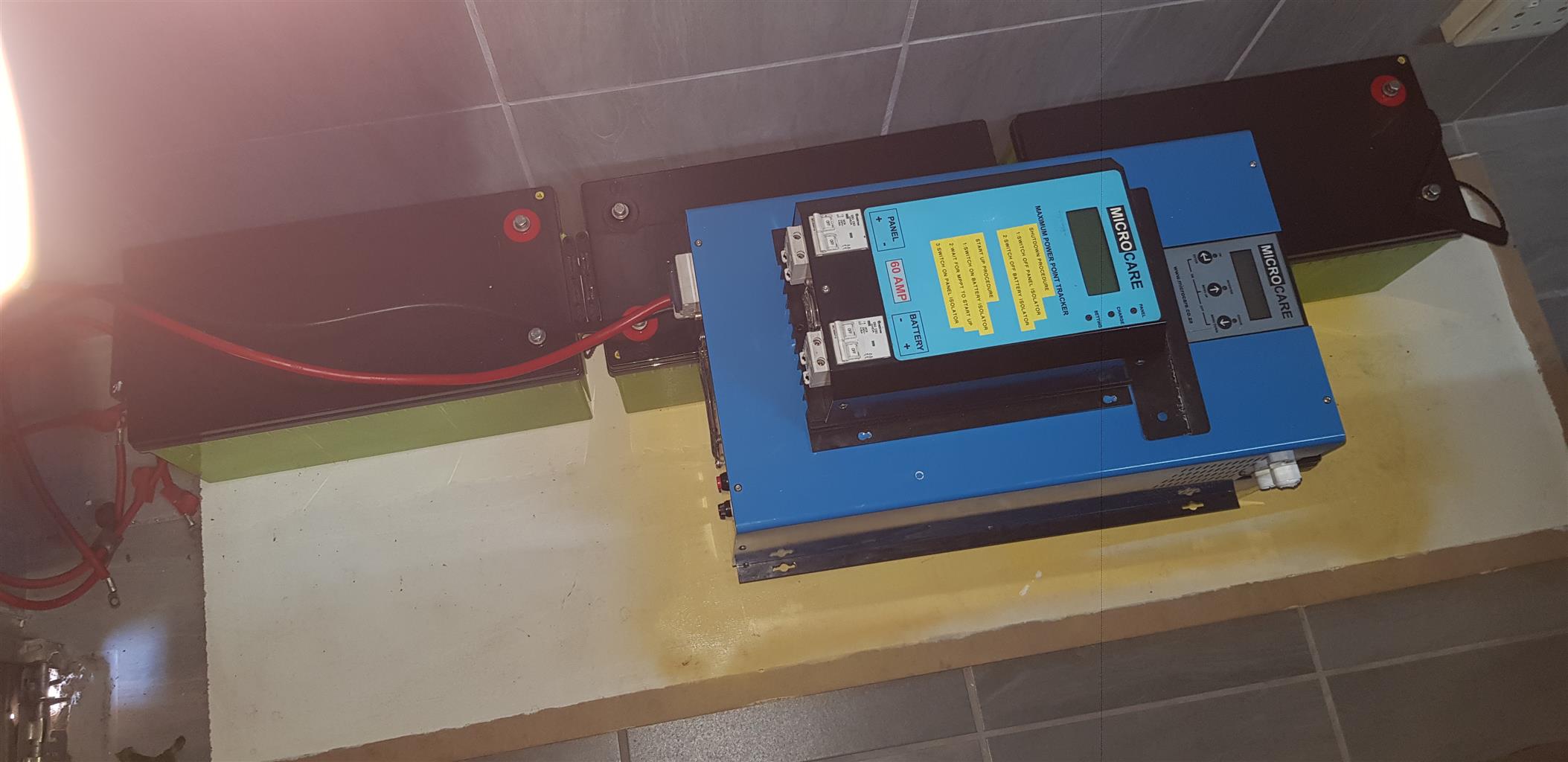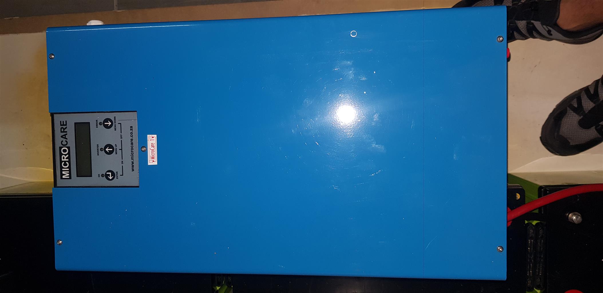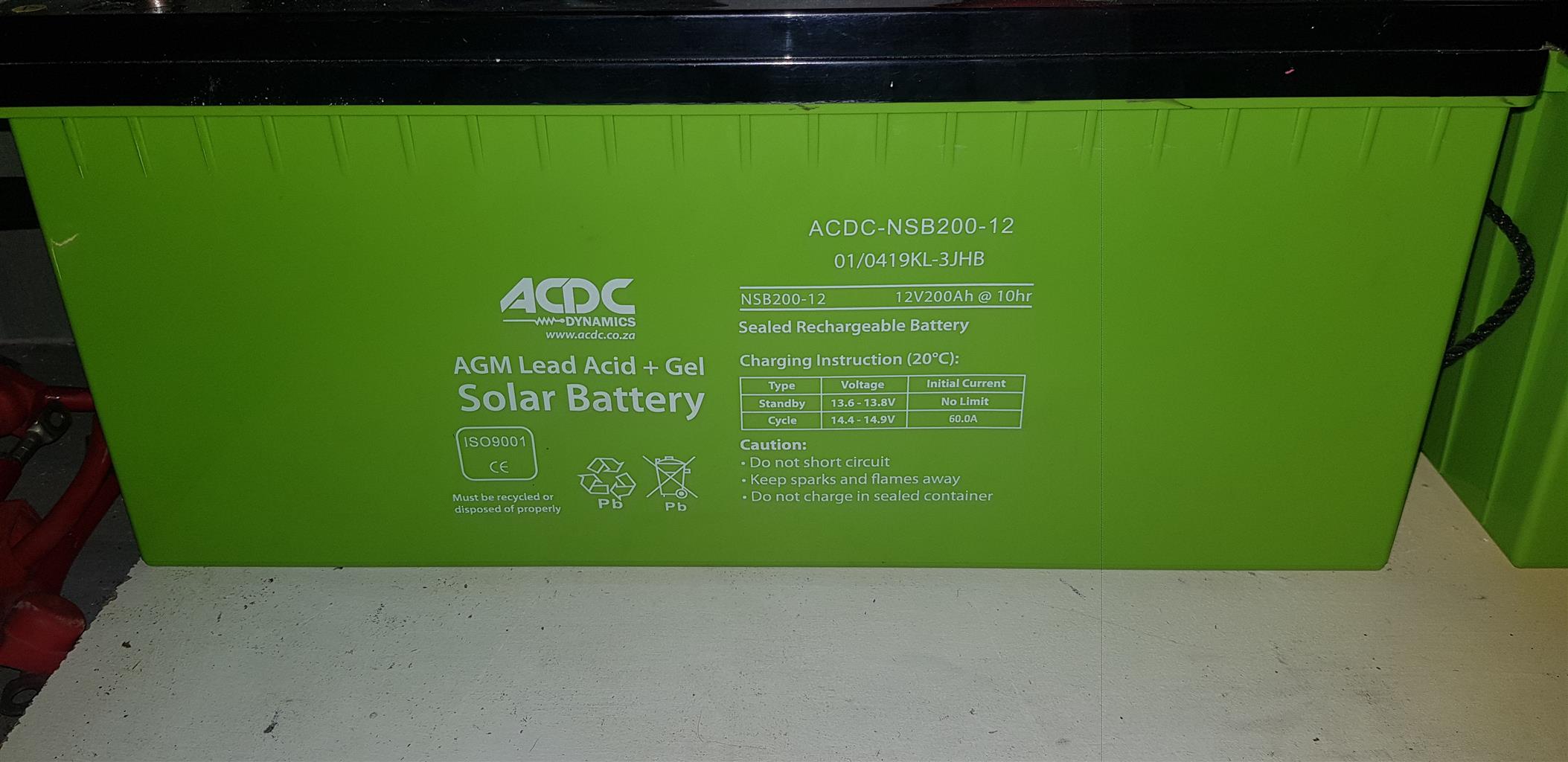 1xMicrocare 5kw inverter, 1xMicrocare 60 Amp MPPT charger and 4x200ahr gel solar deep cycle batteries.