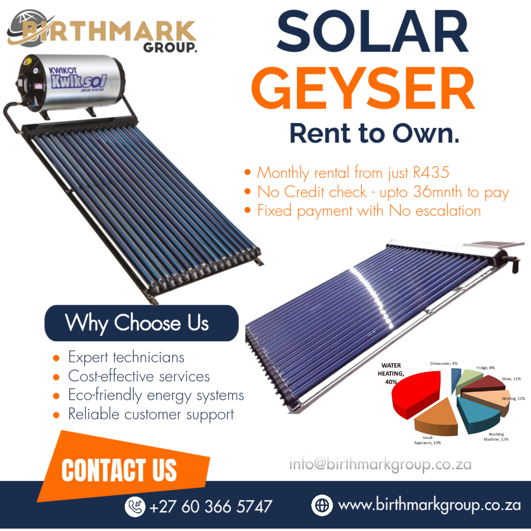 Solar Geysers rent to own option available- 060 366 5747view more or info@birthmarkgroup.co.zaview email...