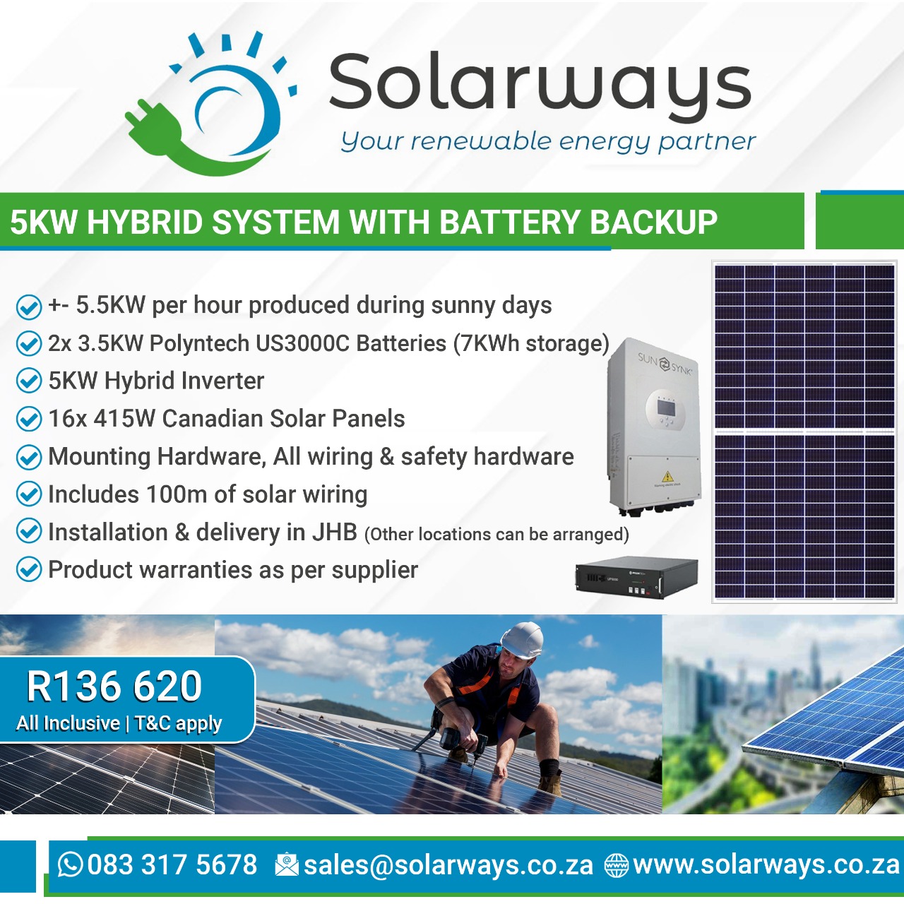 Solar-powered systems fully installed by accredited installers, which include solar panels, inverters and also batteries to power your life. A complete kit with all the major components needed to convert to solar power for your home or office. We offer only the best quality solar components for solar kits. Installations are available in the Johannesburg area. (other areas on request)