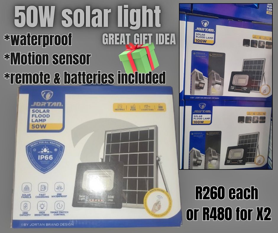 50W solar light X10 available *good quality solar light with panel *remote/batteries included *fittings needed for install are included in the box *waterproof Bargain price of R260 each or R480 for X2!