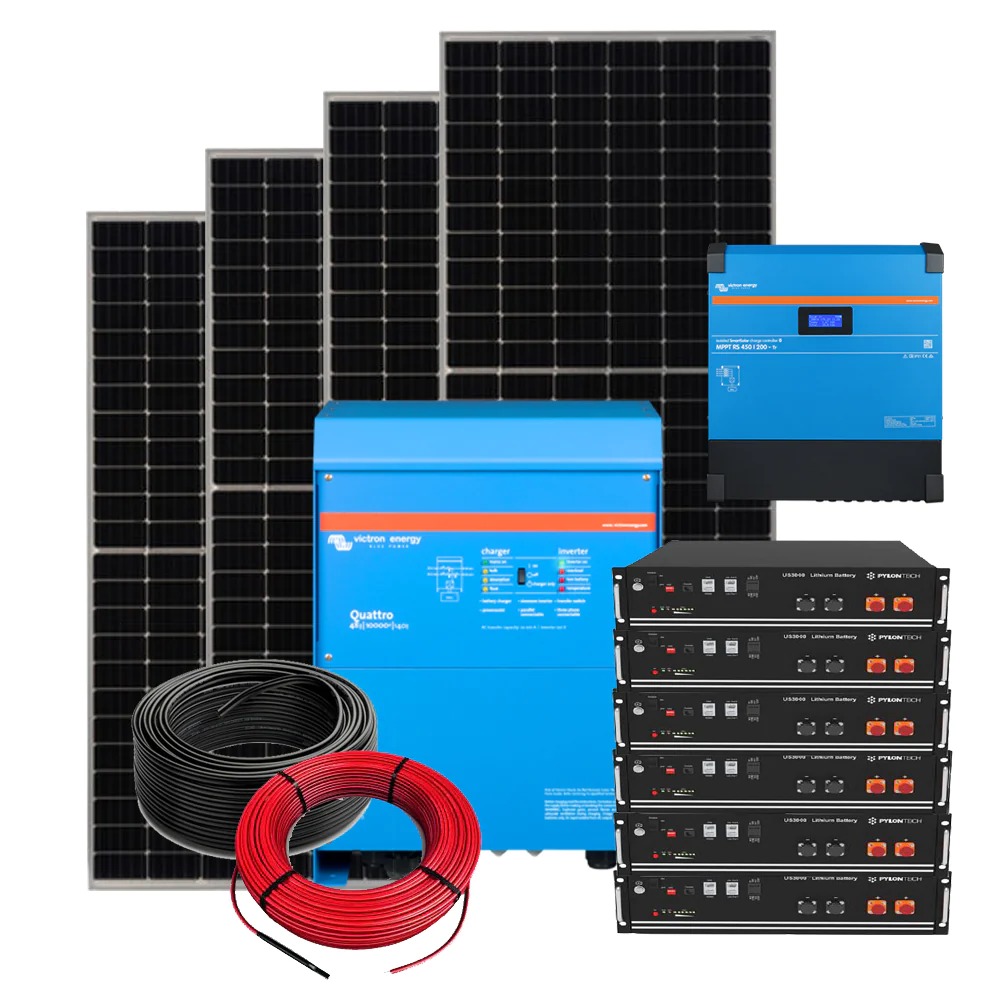 Your chosen system consists of a Victron Quattro 48-10000-140-100-100 & SmartSolar MPPT RS 450/200 Tr inverter with 30 Canadian Solar 375W Super High Power Mono PERC HiKU with MC4-EVO2 modules and Pylon US3000C 3.5kWh Li-Ion Solar Battery (excl. brackets) (Pack of 6).