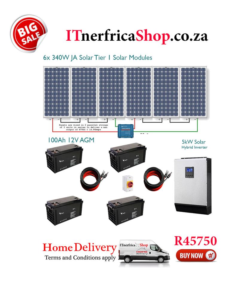 1x 5kva Solar Hybrid inverter 6x 340w Solar module 3x Vision 100Ah 12v AGM Sealed 50m x 4.0mm Cable DC Switch MC4 Connector kit Mouting Clips WhatsApp 078 832 3035view more to check stock availability @ITnerfricaShop